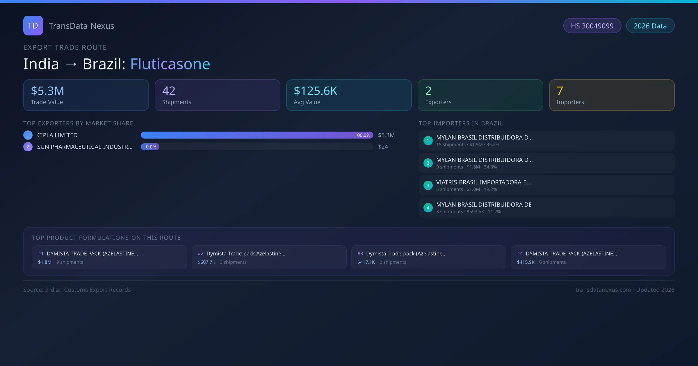 India has recorded 42 verified shipments of Fluticasone exported to Brazil, representing a combined trade value of $5.3M USD. This corridor is served by 2 active Indian exporters, with an average shipment value of $125.6K USD. The leading Indian exporter is CIPLA LIMITED, which accounts for 100% of total export value with 36 shipments worth $5.3M USD. On the buying side, MYLAN BRASIL DISTRIBUIDORA DE MEDIC is the largest importer in Brazil with $1.9M USD in purchases. All data sourced from Indian Customs (DGFT) shipping bill records. Values reported in FOB USD.