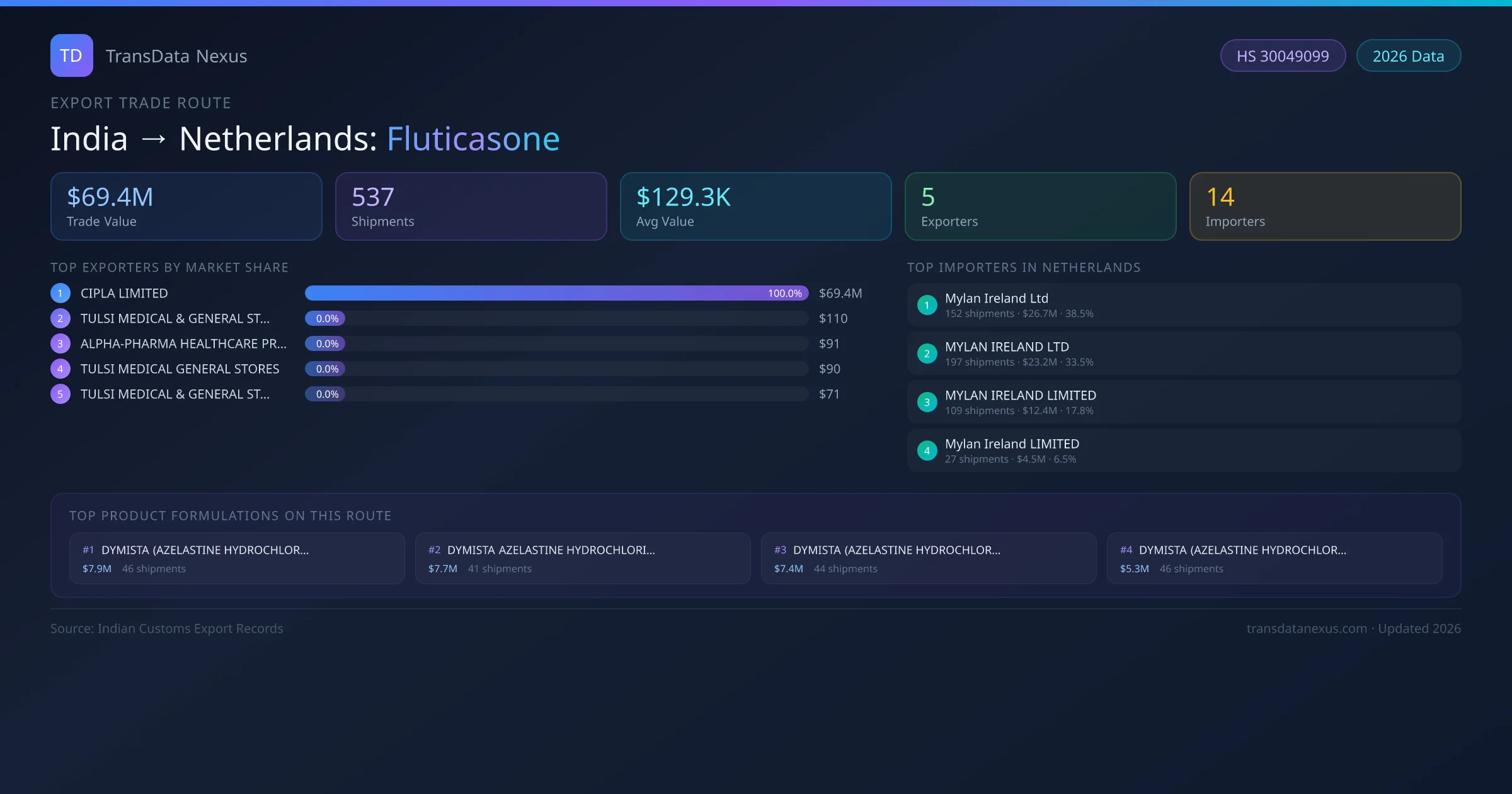 On the import side, key buyers of Indian fluticasone in Netherlands include Mylan Ireland Ltd, MYLAN IRELAND LTD, MYLAN IRELAND LIMITED and 11 others. Mylan Ireland Ltd is the single largest importer with 152 shipments valued at $26.7M USD.