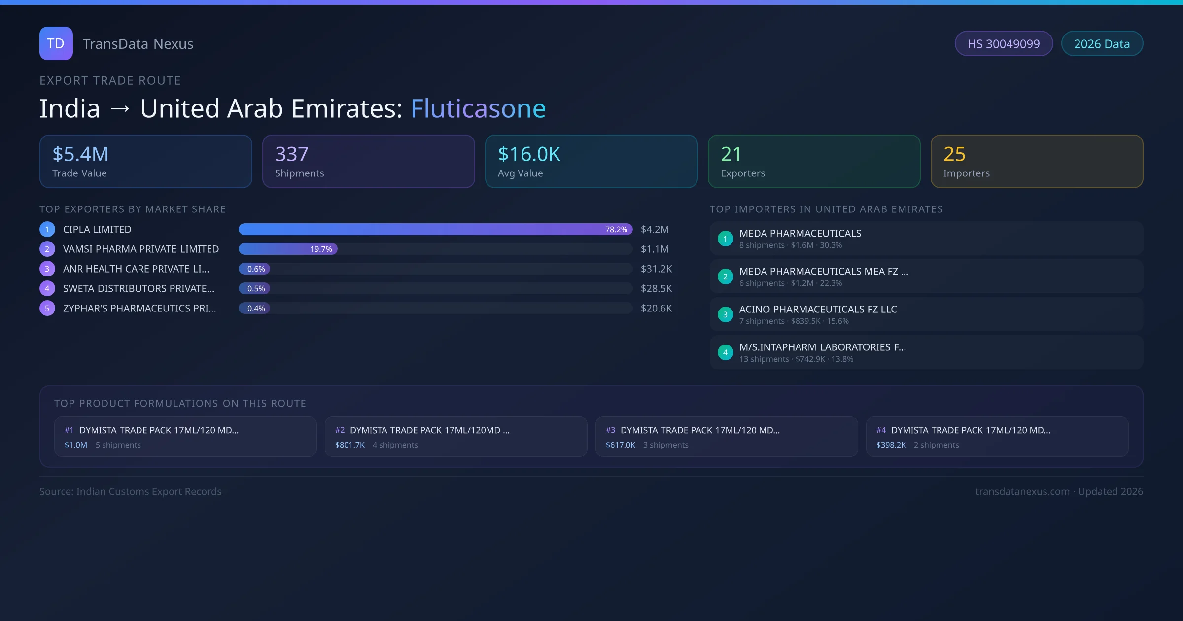 The India to United Arab Emirates Fluticasone corridor is one of India's established pharmaceutical export routes, with 337 shipments documented worth a combined $5.4M USD. The route is dominated by CIPLA LIMITED, which alone accounts for roughly 78% of all export value, reflecting the consolidated nature of India's fluticasone manufacturing sector.