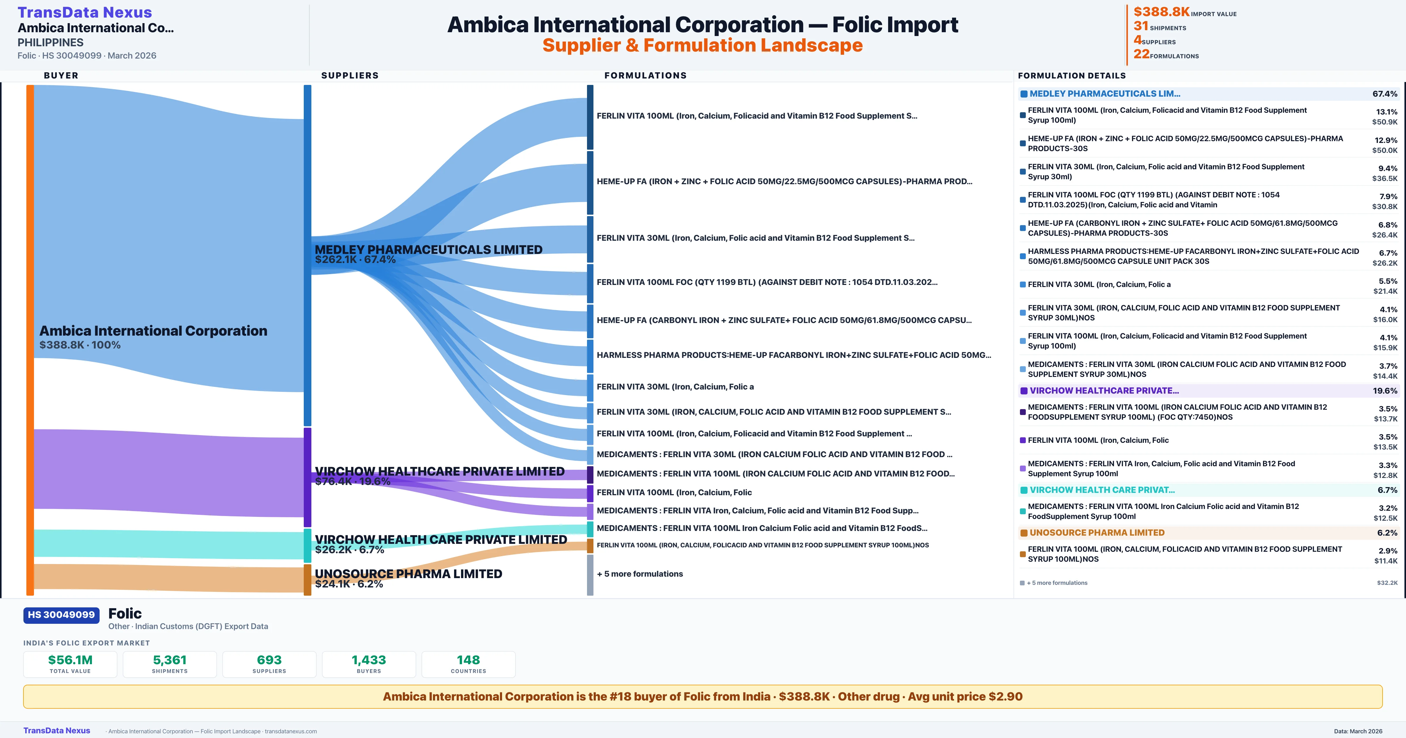 AMBICA INTERNATIONAL CORPORATION sources Folic from 4 verified Indian suppliers: MEDLEY PHARMACEUTICALS LIMITED ($262.1K, 67.4%), VIRCHOW HEALTHCARE PRIVATE LIMITED ($76.4K, 19.6%), VIRCHOW HEALTH CARE PRIVATE LIMITED ($26.2K, 6.7%), UNOSOURCE PHARMA LIMITED ($24.1K, 6.2%). This is based on 31 customs records.