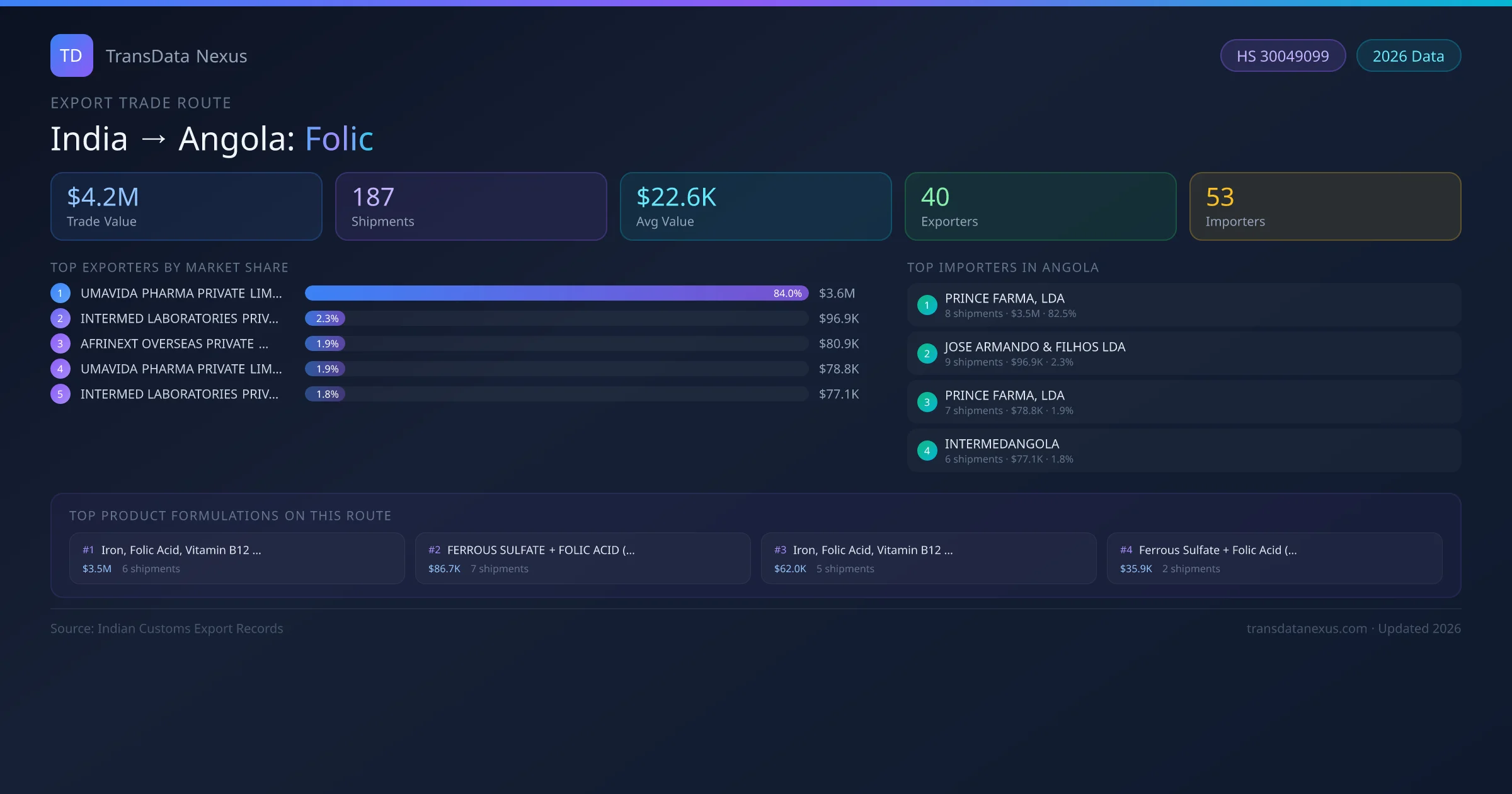 - 1.Route Identification: India to Angola export trade corridor identified from Indian Customs (DGFT) records for Folic.