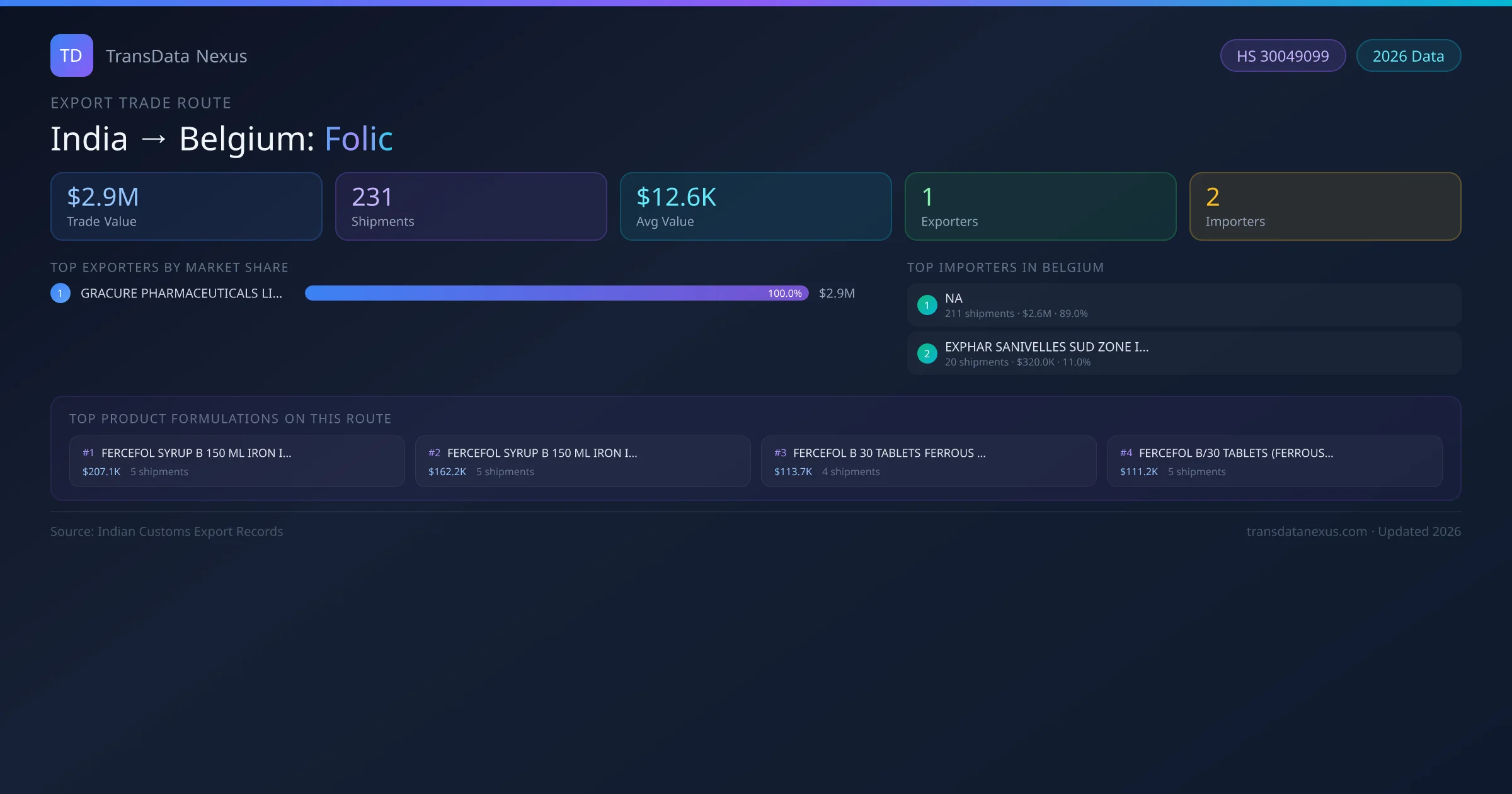 The India to Belgium Folic corridor is one of India's established pharmaceutical export routes, with 231 shipments documented worth a combined $2.9M USD. The route is dominated by GRACURE PHARMACEUTICALS LIMITED, which alone accounts for roughly 100% of all export value, reflecting the consolidated nature of India's folic manufacturing sector.