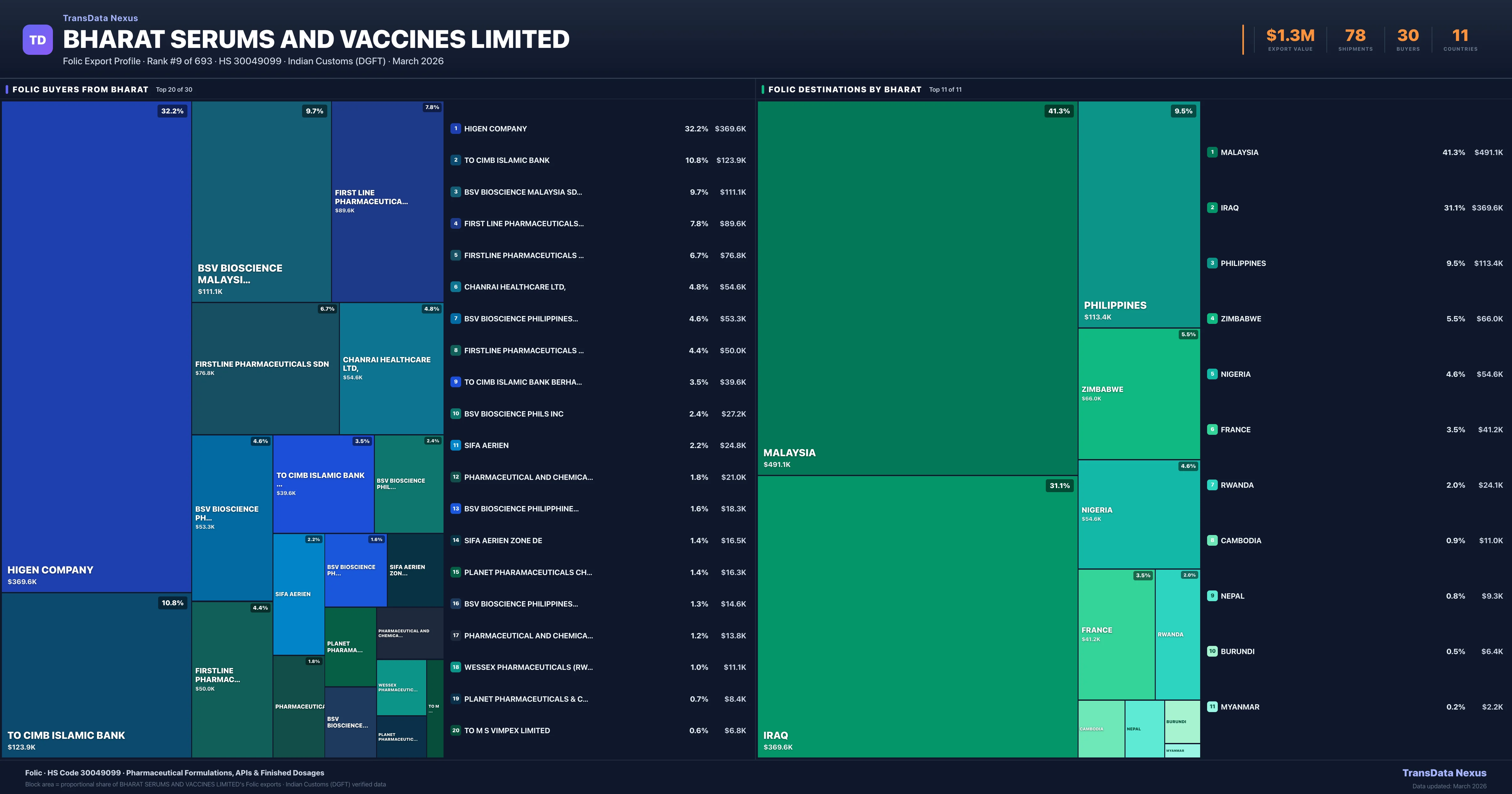 - 4.Verified Records: This page is backed by 78 individual customs records matching Bharat Serums AND Vaccines Limited exporting Folic, covering 51 formulations to 11 countries via 30 buyers.