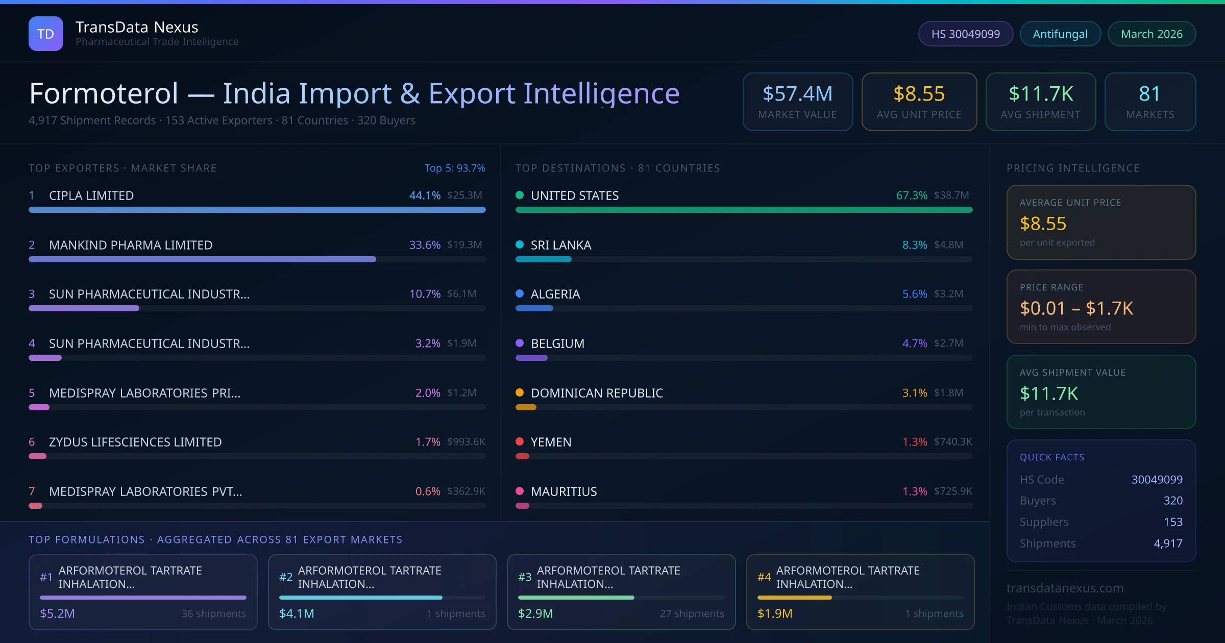 Between 2022 and 2026, India exported $57.4M worth of formoterol across 4,917 verified shipments to 81 countries — covering 42% of world markets in the Respiratory & OTC segment. The largest destination is UNITED STATES (67.3%). CIPLA LIMITED leads with a 44.1% share. All figures are drawn from Indian Customs (DGFT) shipping bill records spanning four years of trade activity.