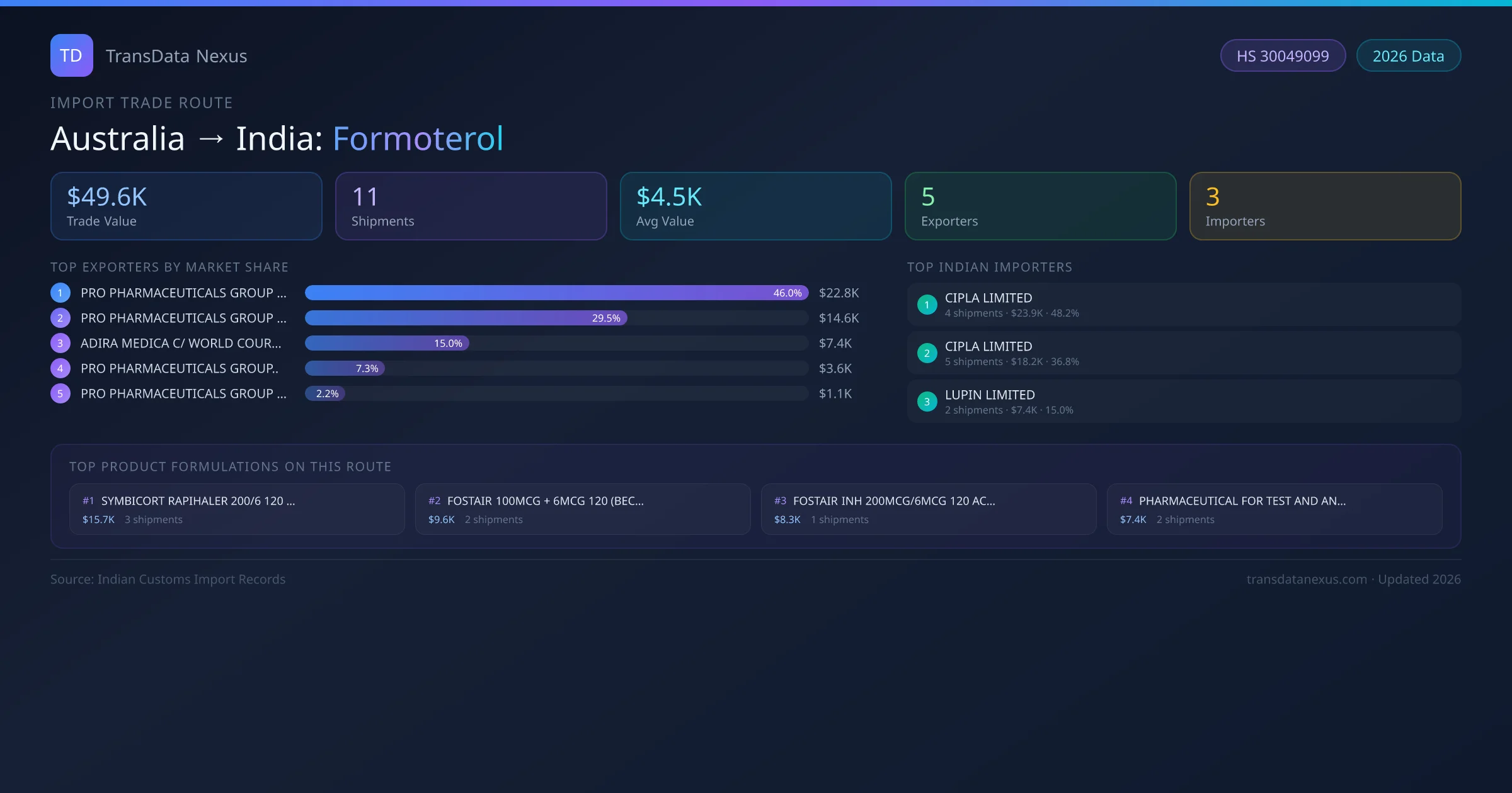 On the receiving end of this trade route, the leading Indian importers of Australia formoterol include CIPLA LIMITED, CIPLA LIMITED , LUPIN LIMITED . The largest importer is CIPLA LIMITED, accounting for $23.9K USD across 4 shipments — representing 48% of all formoterol imports from Australia on this route.