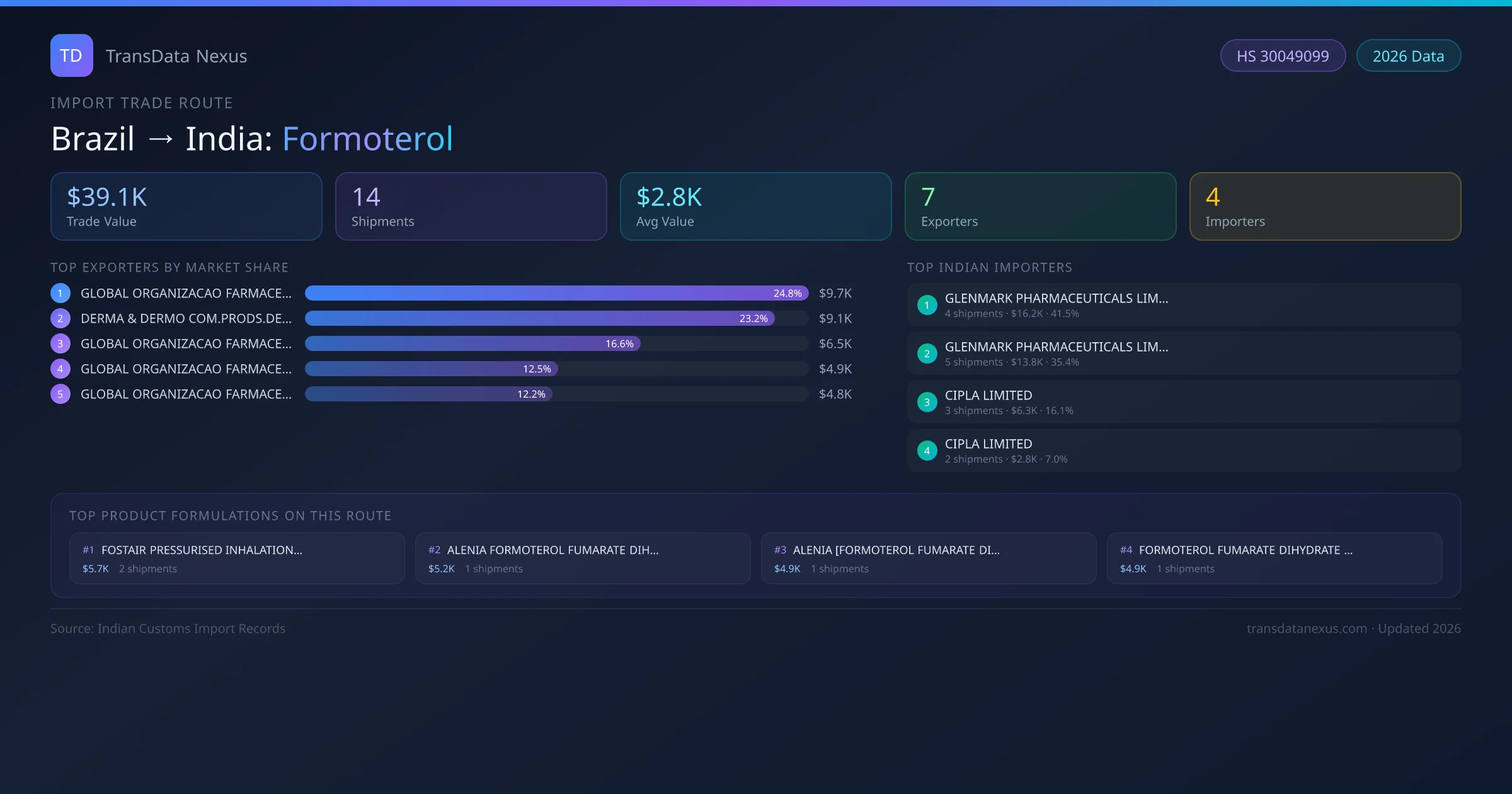 The Brazil to India Formoterol corridor is one of India's established pharmaceutical import routes from Brazil, with 14 shipments documented worth a combined $39.1K USD. The route is dominated by GLOBAL ORGANIZACAO FARMACEUTICA LTDA, which alone accounts for roughly 25% of all import value, reflecting the consolidated nature of Brazil's formoterol export sector.