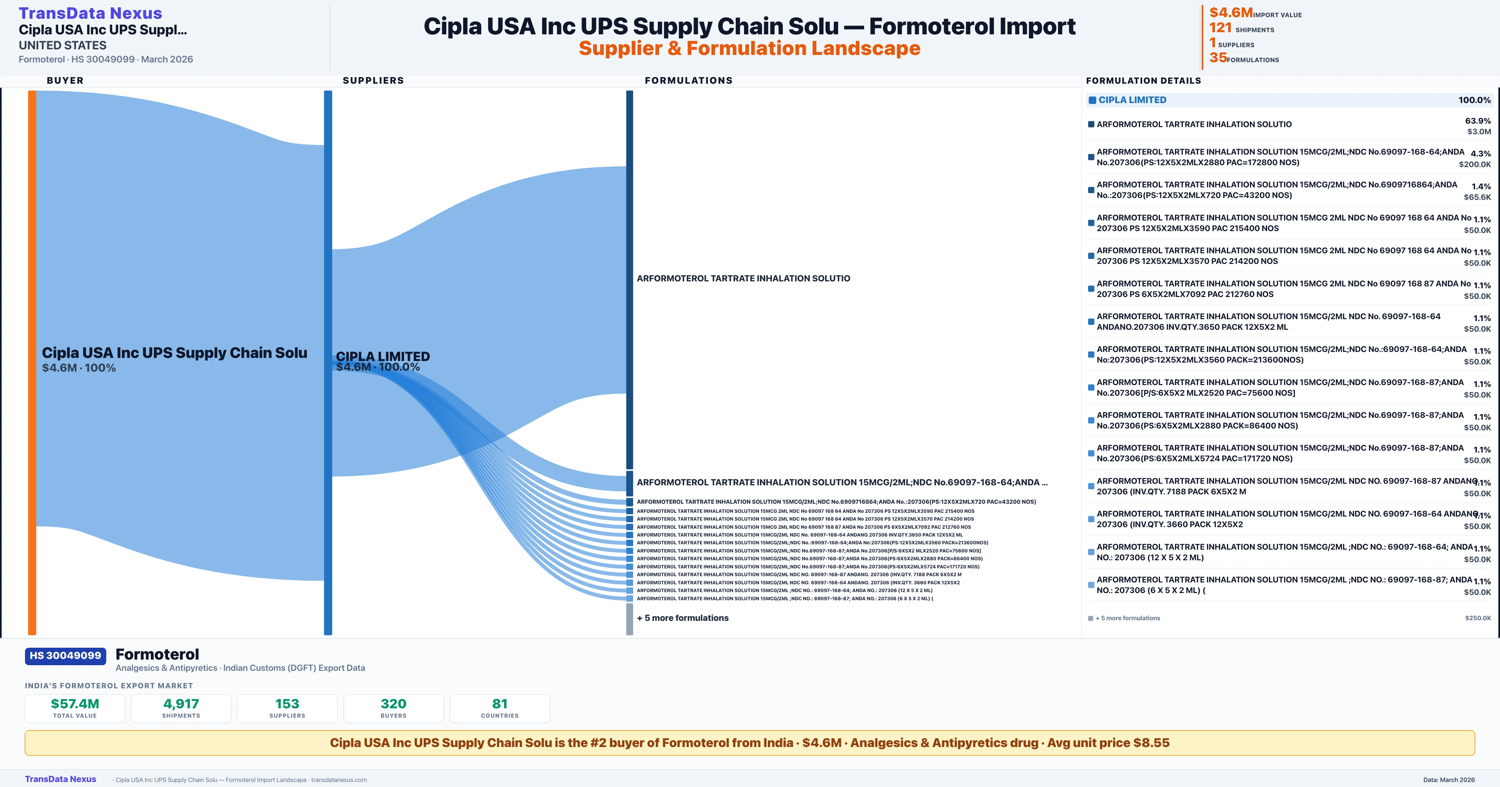 CIPLA USA INC UPS SUPPLY CHAIN SOLU sources Formoterol from 1 verified Indian supplier: CIPLA LIMITED ($4.6M, 100.0%). This is based on 121 customs records.