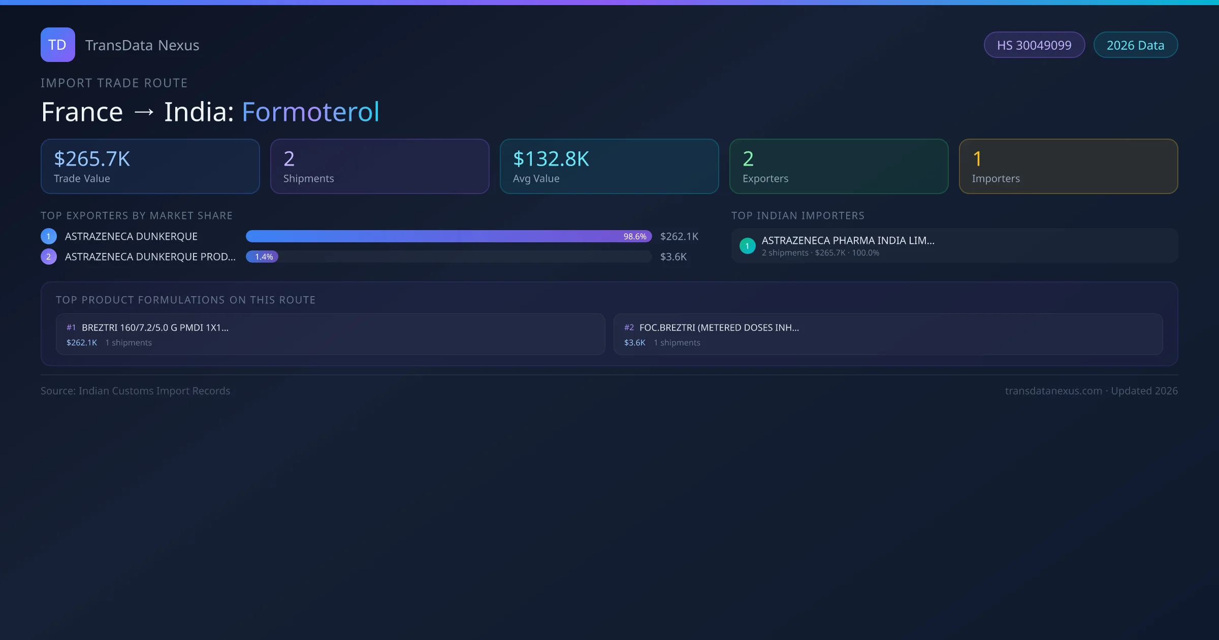 On the receiving end of this trade route, the leading Indian importers of France formoterol include ASTRAZENECA PHARMA INDIA LIMITED. The largest importer is ASTRAZENECA PHARMA INDIA LIMITED, accounting for $265.7K USD across 2 shipments — representing 100% of all formoterol imports from France on this route.