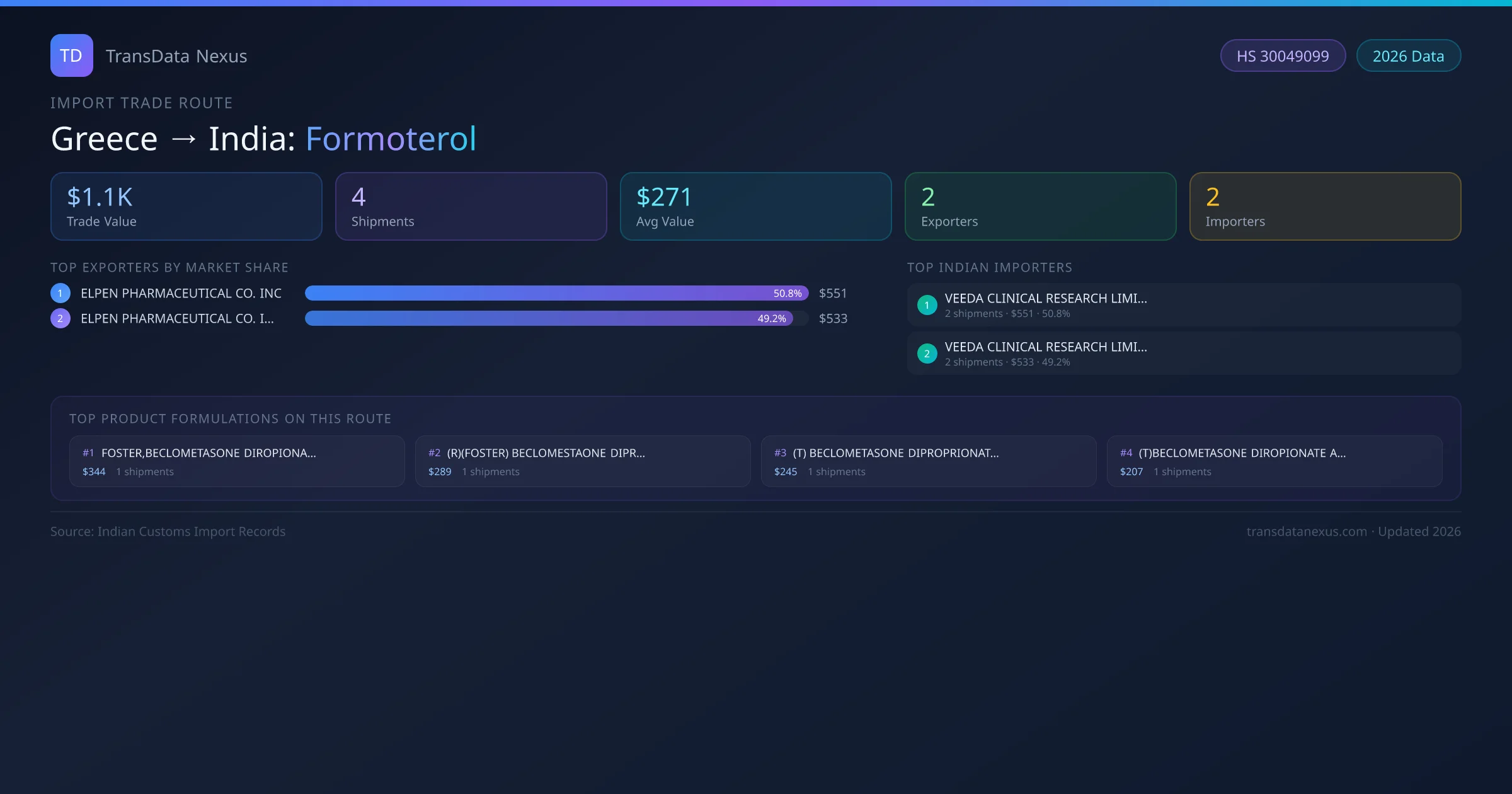 India imports Formoterol from Greece worth approximately $1.1K USD across 4 recorded shipments. The average value per shipment is $271 USD.
