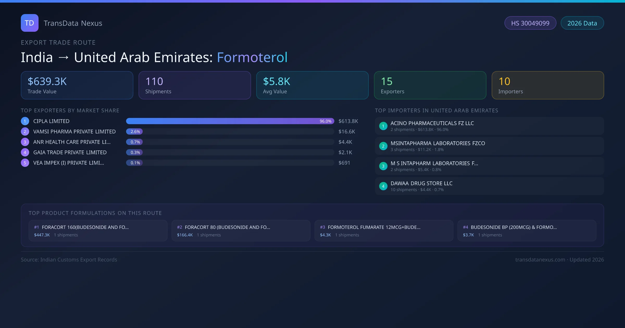 - 1.Route Identification: India to United Arab Emirates export trade corridor identified from Indian Customs (DGFT) records for Formoterol.