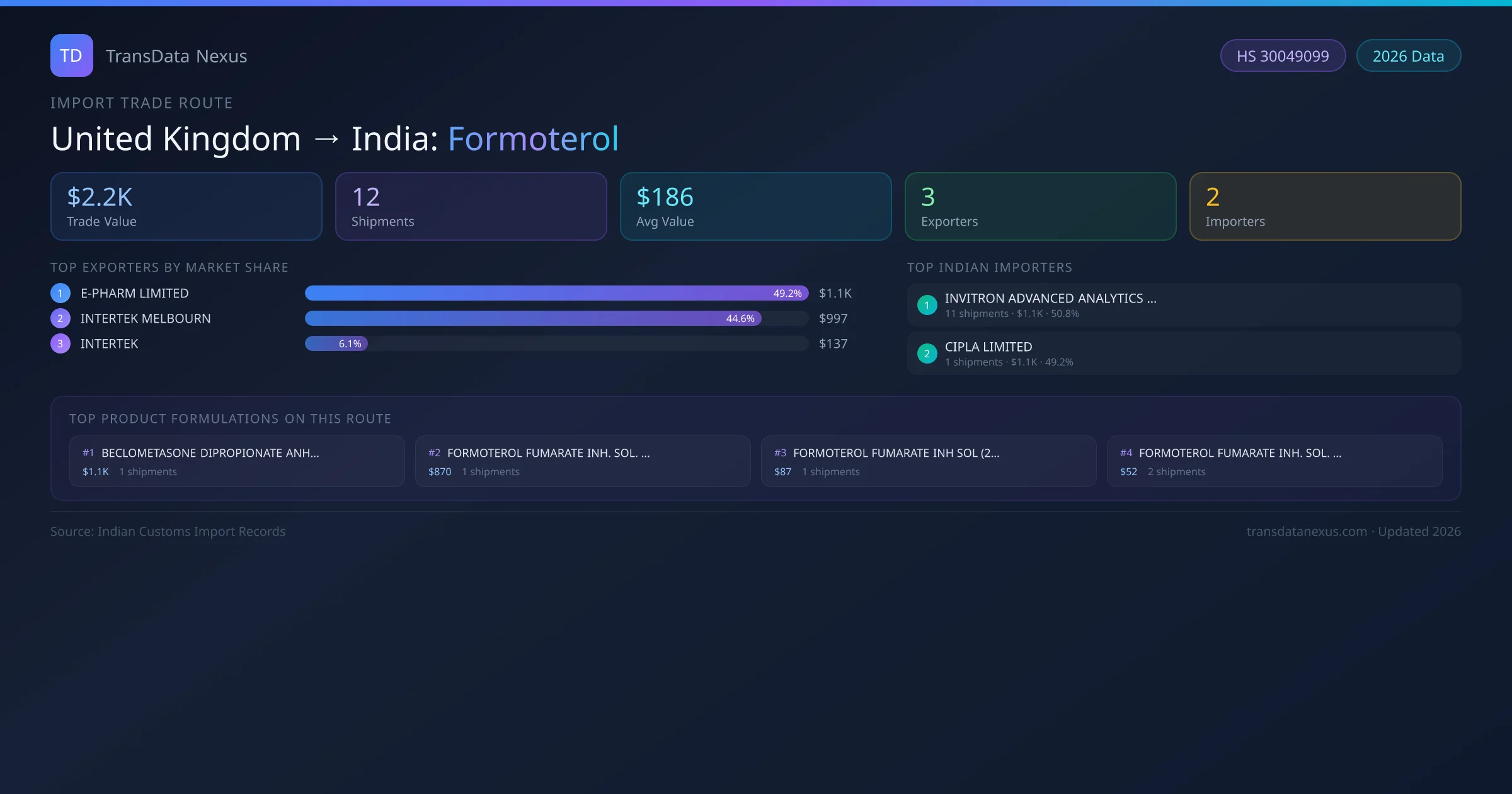 India has recorded 12 verified shipments of Formoterol imported from United Kingdom, representing a combined trade value of $2.2K USD. This corridor is served by 3 active United Kingdom exporters, with an average shipment value of $186 USD. The leading United Kingdom supplier is E-PHARM LIMITED, which accounts for 49% of total import value with 1 shipments worth $1.1K USD. On the buying side, INVITRON ADVANCED ANALYTICS PRIVATE LIMITED is the largest Indian importer with $1.1K USD in purchases. The top 3 suppliers — E-PHARM LIMITED, INTERTEK MELBOURN, INTERTEK — together control 100% of total trade value on this route. All data sourced from Indian Customs (DGFT) shipping bill of entry records. Values reported in FOB USD.