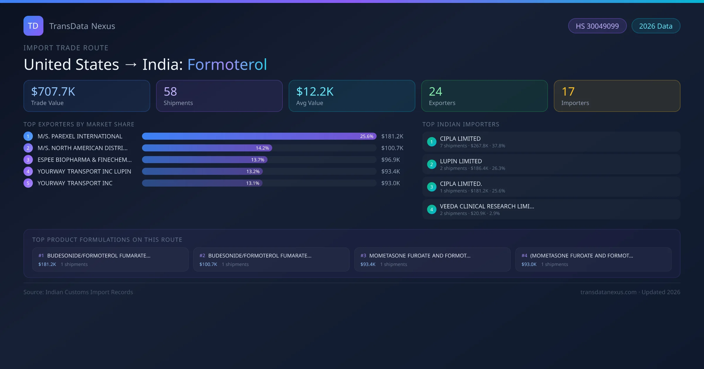On the buying side, CIPLA LIMITED is the largest importer with 7 shipments worth $267.8K USD — representing 38% of all formoterol imports from United States on this route. A total of 17 buyers are active on this corridor.