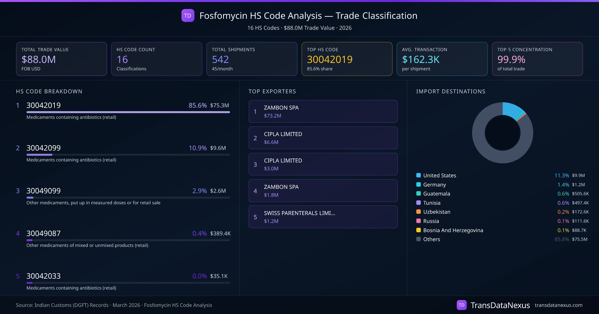 India exports Fosfomycin under 16 distinct HS code classifications, representing a total trade value of $88.0M across 542 shipments. The dominant classification is HS 30042019 (Medicaments containing antibiotics (retail)), accounting for 85.6% of all Fosfomycin trade at $75.3M. HS 30042099 (Medicaments containing antibiotics (retail)) follows at 10.9% ($9.6M). The top 5 HS codes together account for 99.9% of total Fosfomycin trade from India. The average transaction value is $162286. Key importing markets include United States, Germany, Guatemala. Leading exporters include ZAMBON SPA and CIPLA LIMITED. Data sourced from Indian Customs (DGFT) shipping bill records.