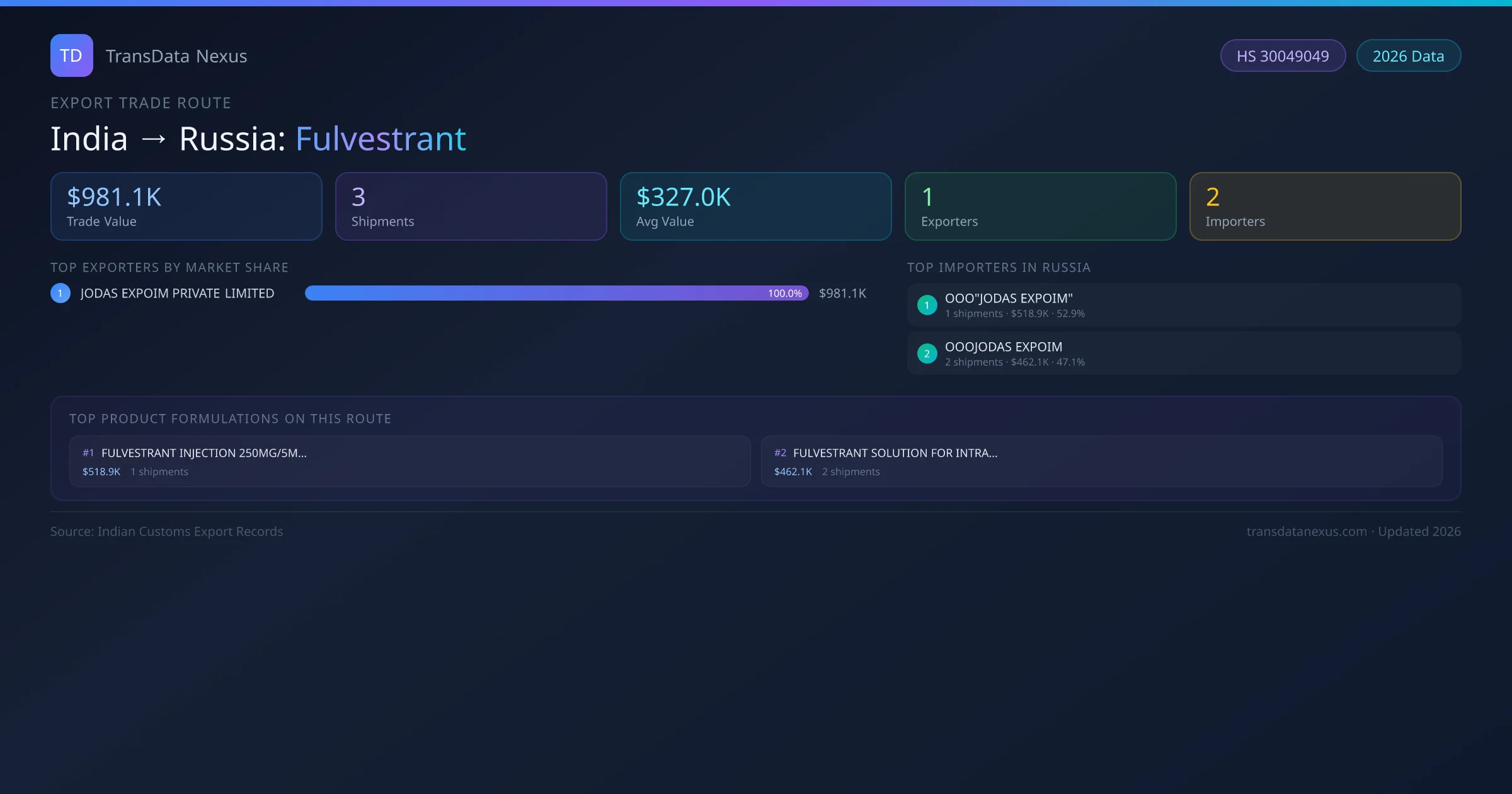 India has recorded 3 verified shipments of Fulvestrant exported to Russia, representing a combined trade value of $981.1K USD. This corridor is served by 1 active Indian exporters, with an average shipment value of $327.0K USD. The leading Indian exporter is JODAS EXPOIM PRIVATE LIMITED, which accounts for 100% of total export value with 3 shipments worth $981.1K USD. On the buying side, OOO"JODAS EXPOIM" is the largest importer in Russia with $518.9K USD in purchases. All data sourced from Indian Customs (DGFT) shipping bill records. Values reported in FOB USD.