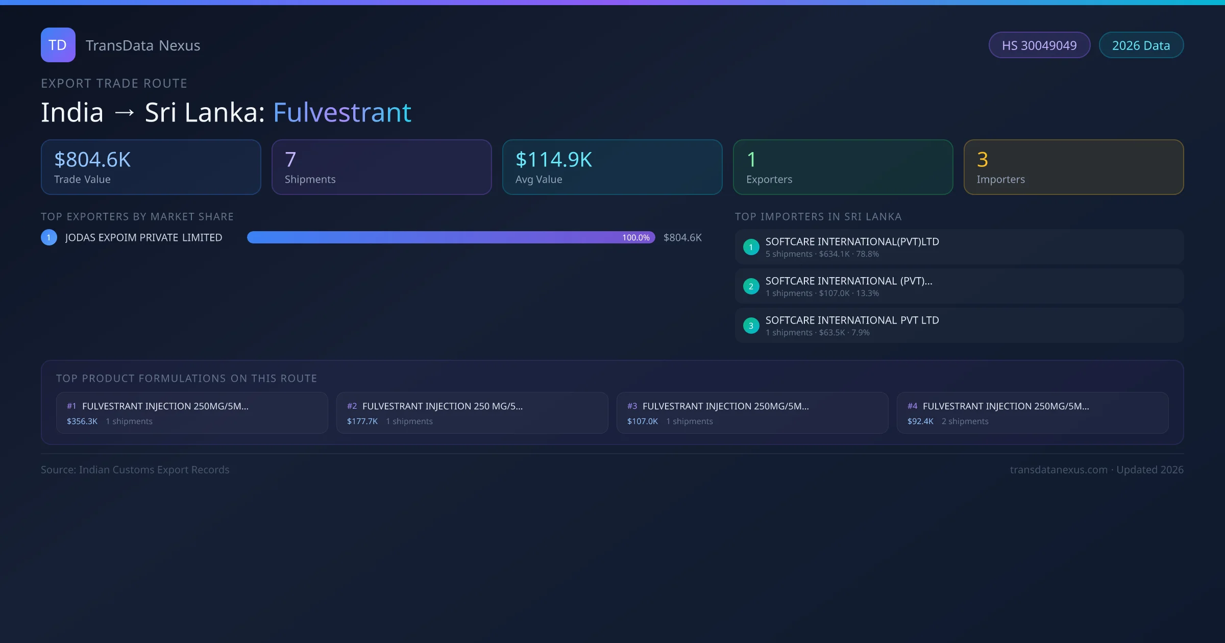 The India to Sri Lanka Fulvestrant corridor is one of India's established pharmaceutical export routes, with 7 shipments documented worth a combined $804.6K USD. The route is dominated by JODAS EXPOIM PRIVATE LIMITED, which alone accounts for roughly 100% of all export value, reflecting the consolidated nature of India's fulvestrant manufacturing sector.
