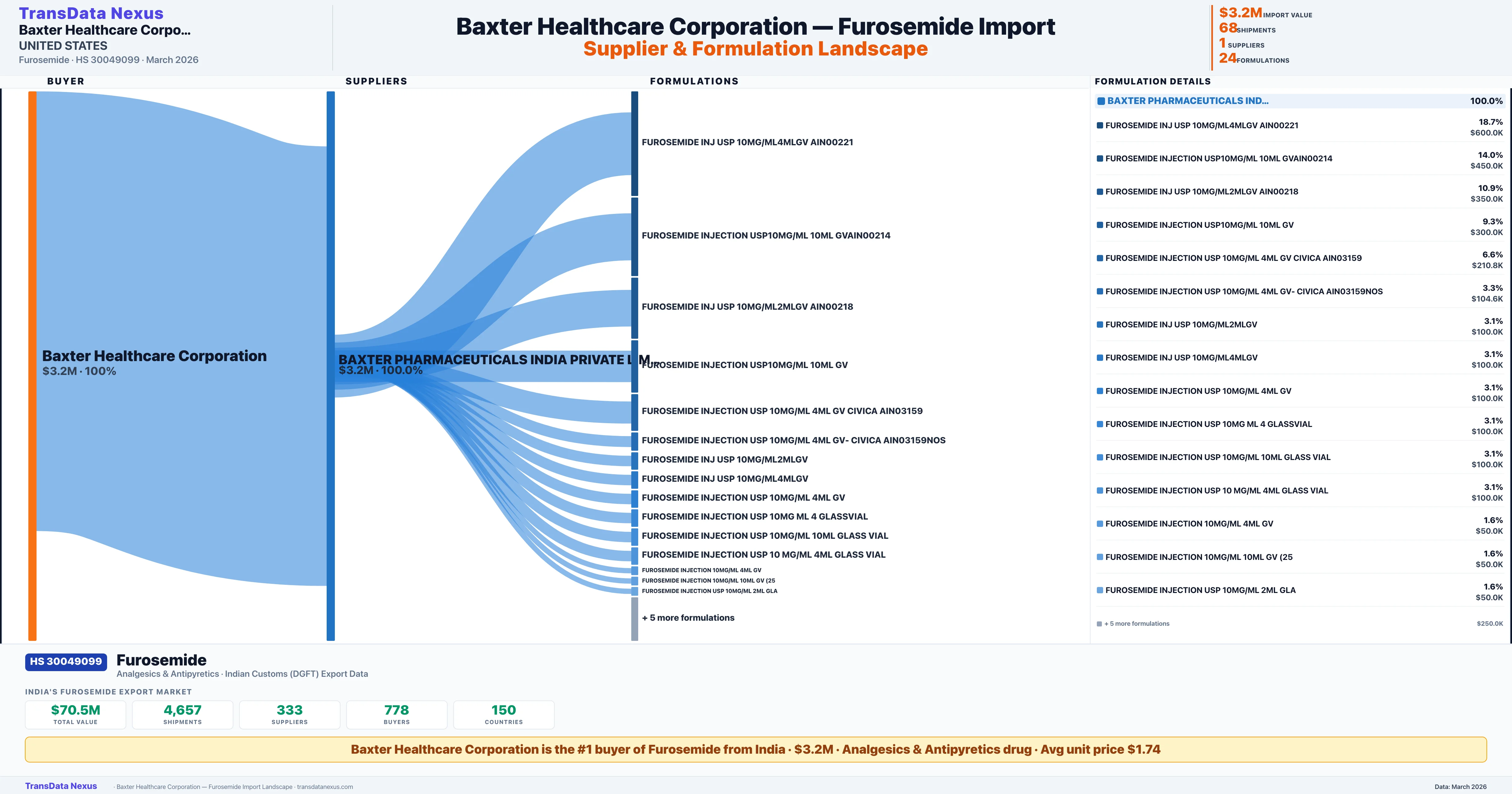 BAXTER HEALTHCARE CORPORATION sources Furosemide from 1 verified Indian supplier: BAXTER PHARMACEUTICALS INDIA PRIVATE LIMITED ($3.2M, 100.0%). This is based on 68 customs records.