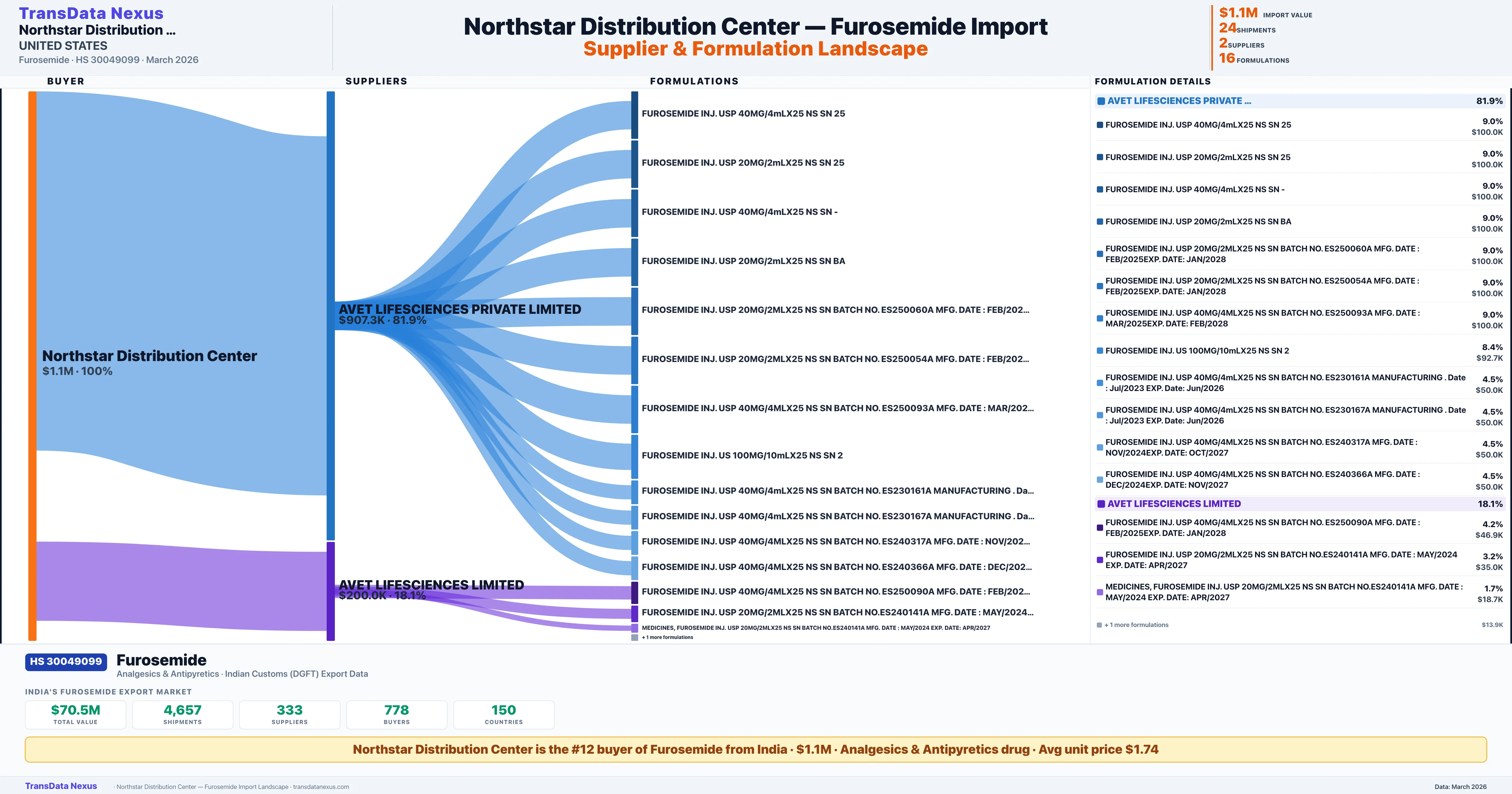 NORTHSTAR DISTRIBUTION CENTER sources Furosemide from 2 verified Indian suppliers: AVET LIFESCIENCES PRIVATE LIMITED ($907.3K, 81.9%), AVET LIFESCIENCES LIMITED ($200.0K, 18.1%). This is based on 24 customs records.