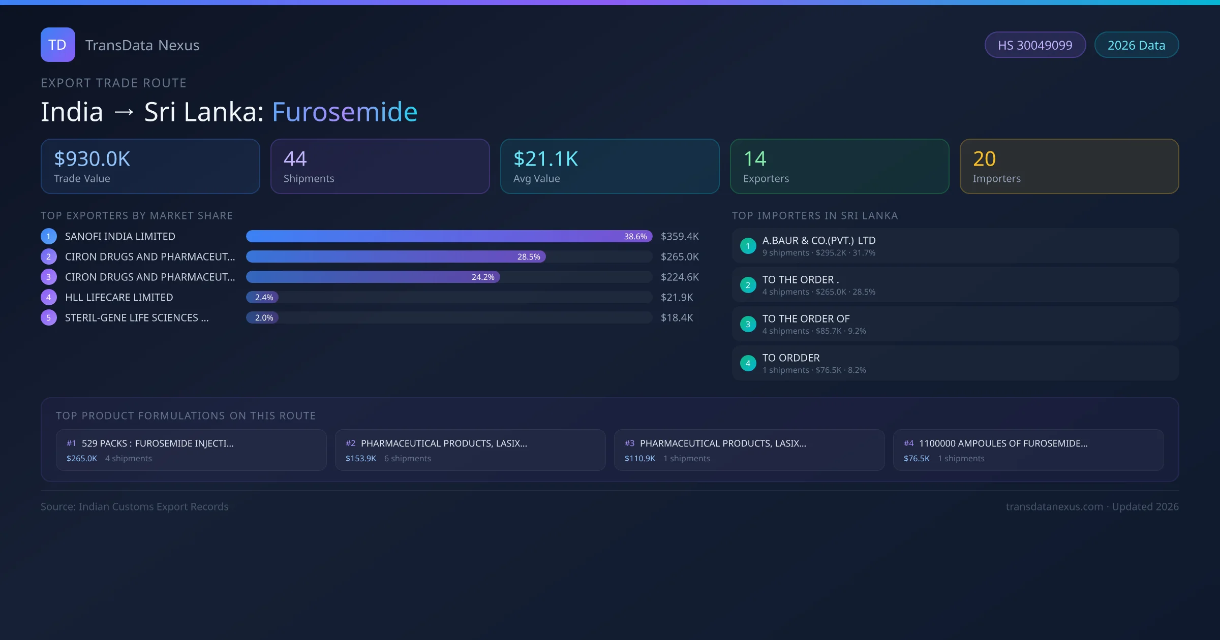 - 1.Route Identification: India to Sri Lanka export trade corridor identified from Indian Customs (DGFT) records for Furosemide.