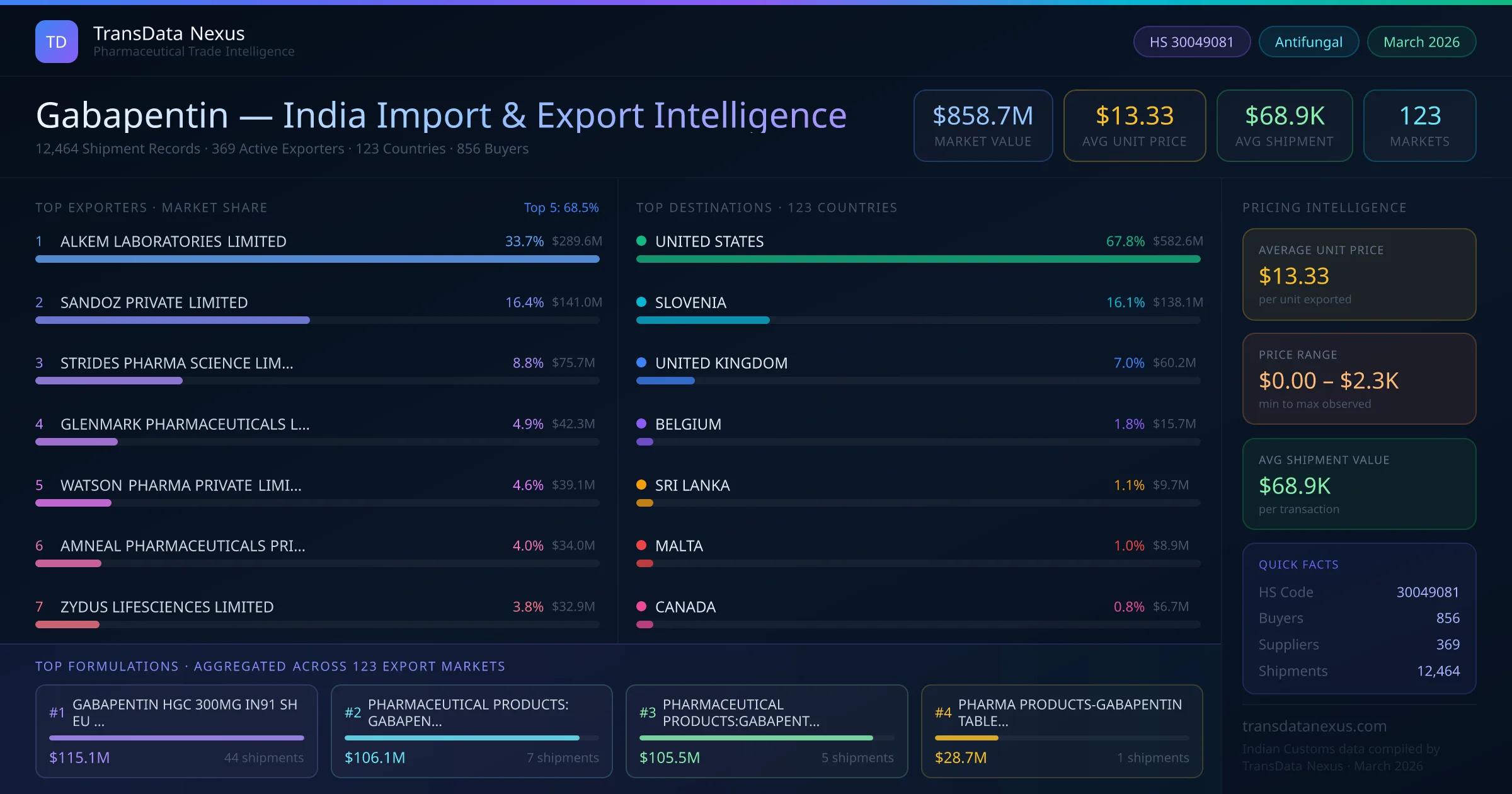 The total export value of gabapentin from India is $858.7M, recorded across 12,464 shipments from 369 active exporters to 123 countries. The average shipment value is $68.9K.