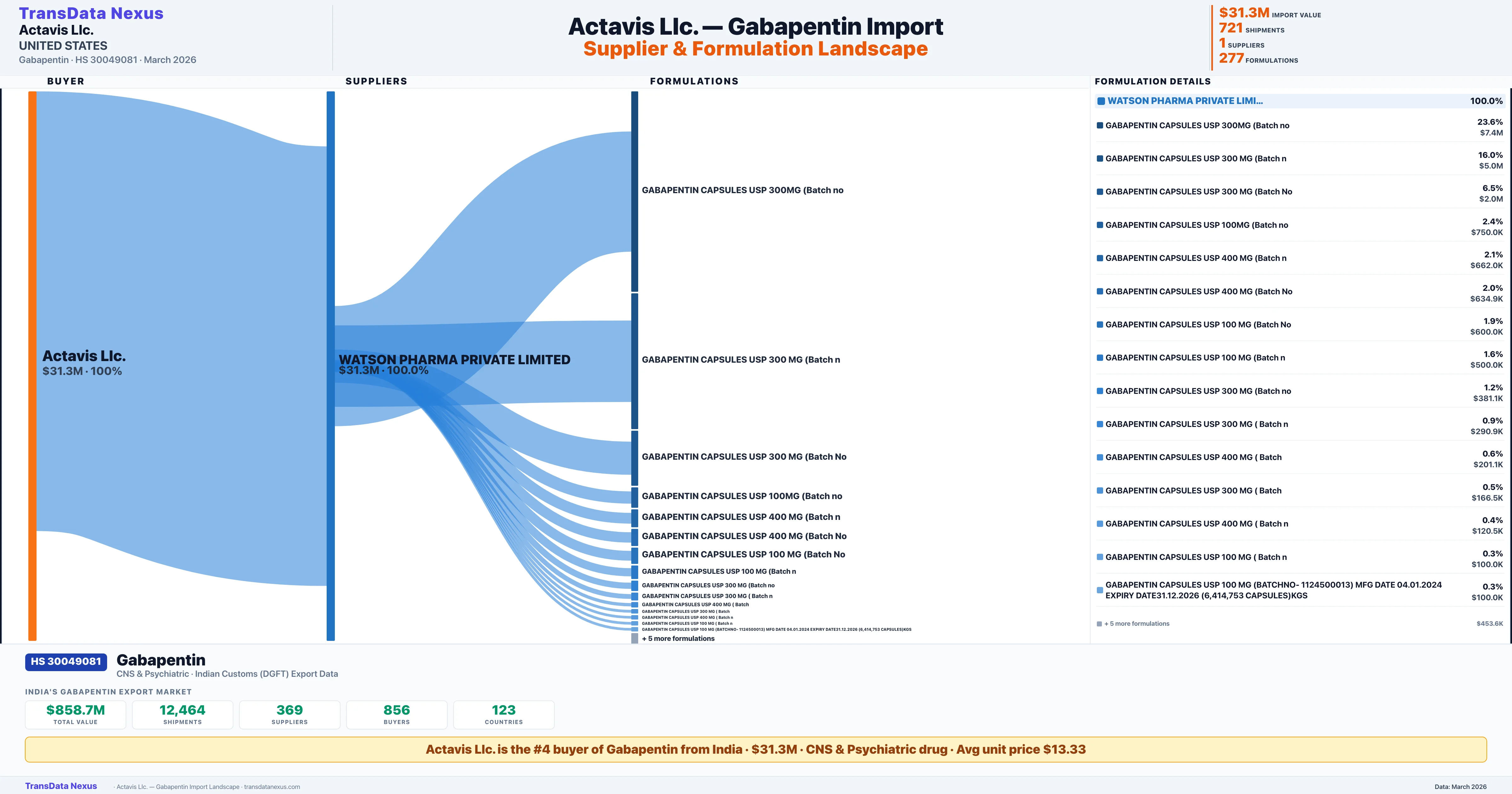 ACTAVIS LLC. sources Gabapentin from 1 verified Indian supplier: WATSON PHARMA PRIVATE LIMITED ($31.3M, 100.0%). This is based on 721 customs records.