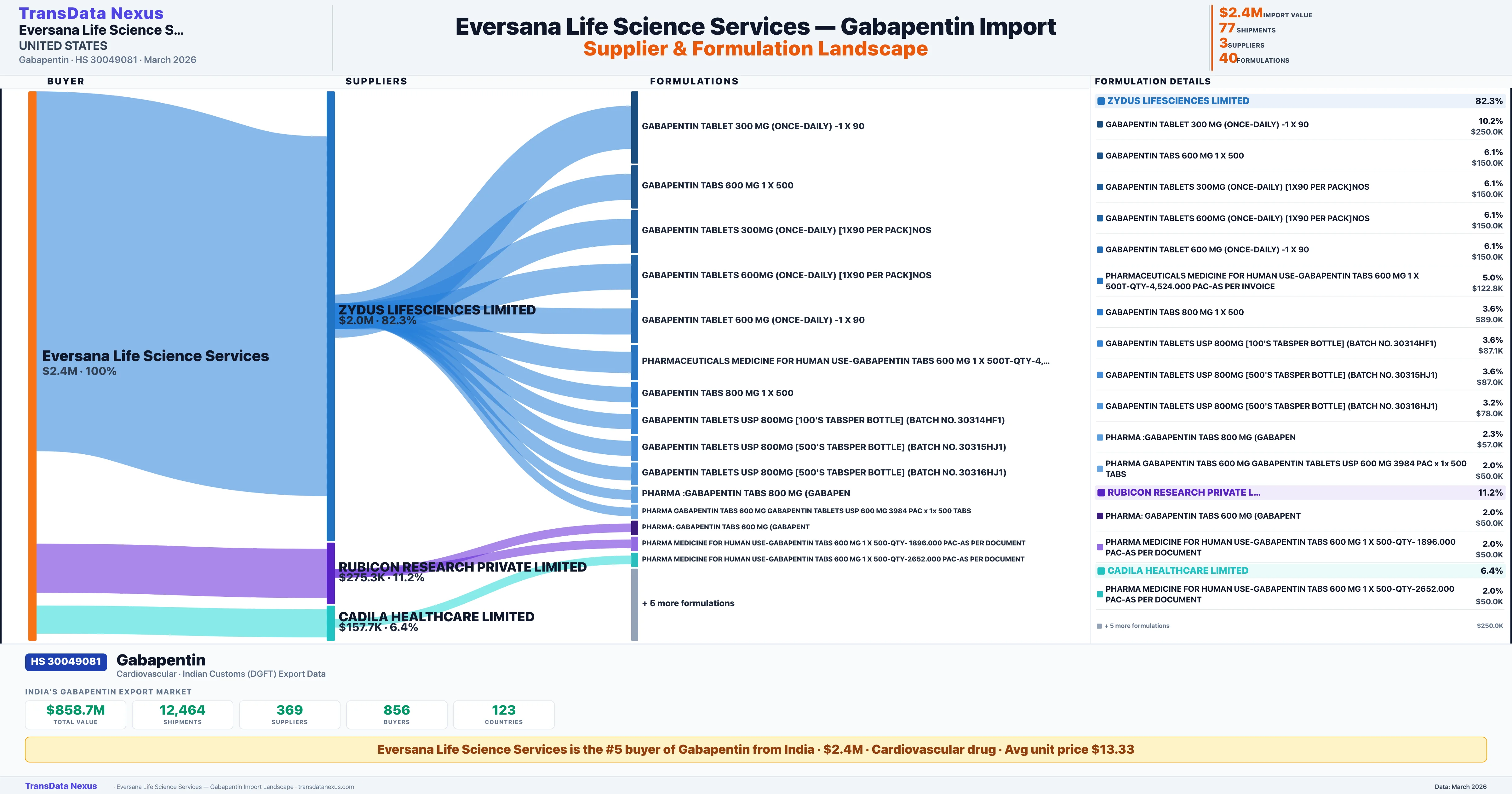 EVERSANA LIFE SCIENCE SERVICES sources Gabapentin from 3 verified Indian suppliers based on 77 customs records. The primary supplier is ZYDUS LIFESCIENCES LIMITED accounting for 82.3% of imports.