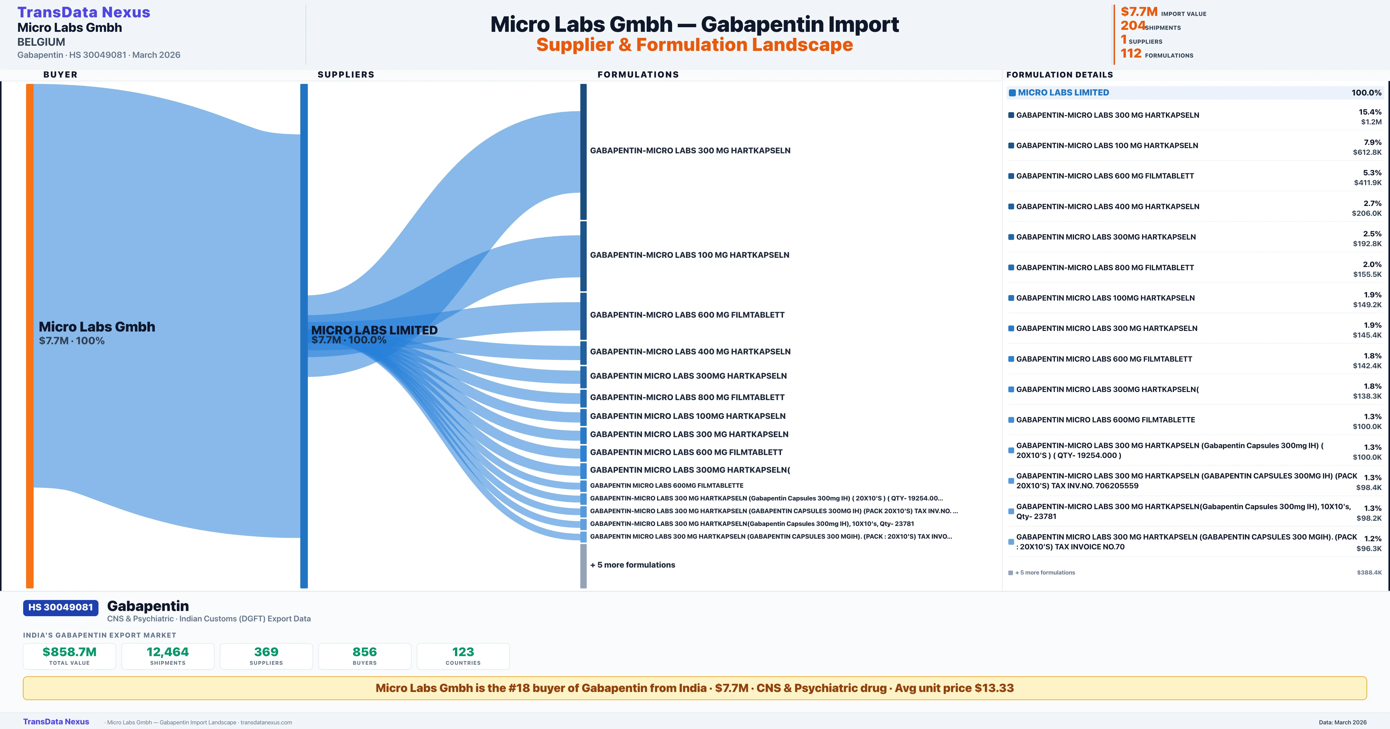 MICRO LABS GMBH sources Gabapentin from 1 verified Indian supplier: MICRO LABS LIMITED ($7.7M, 100.0%). This is based on 204 customs records.