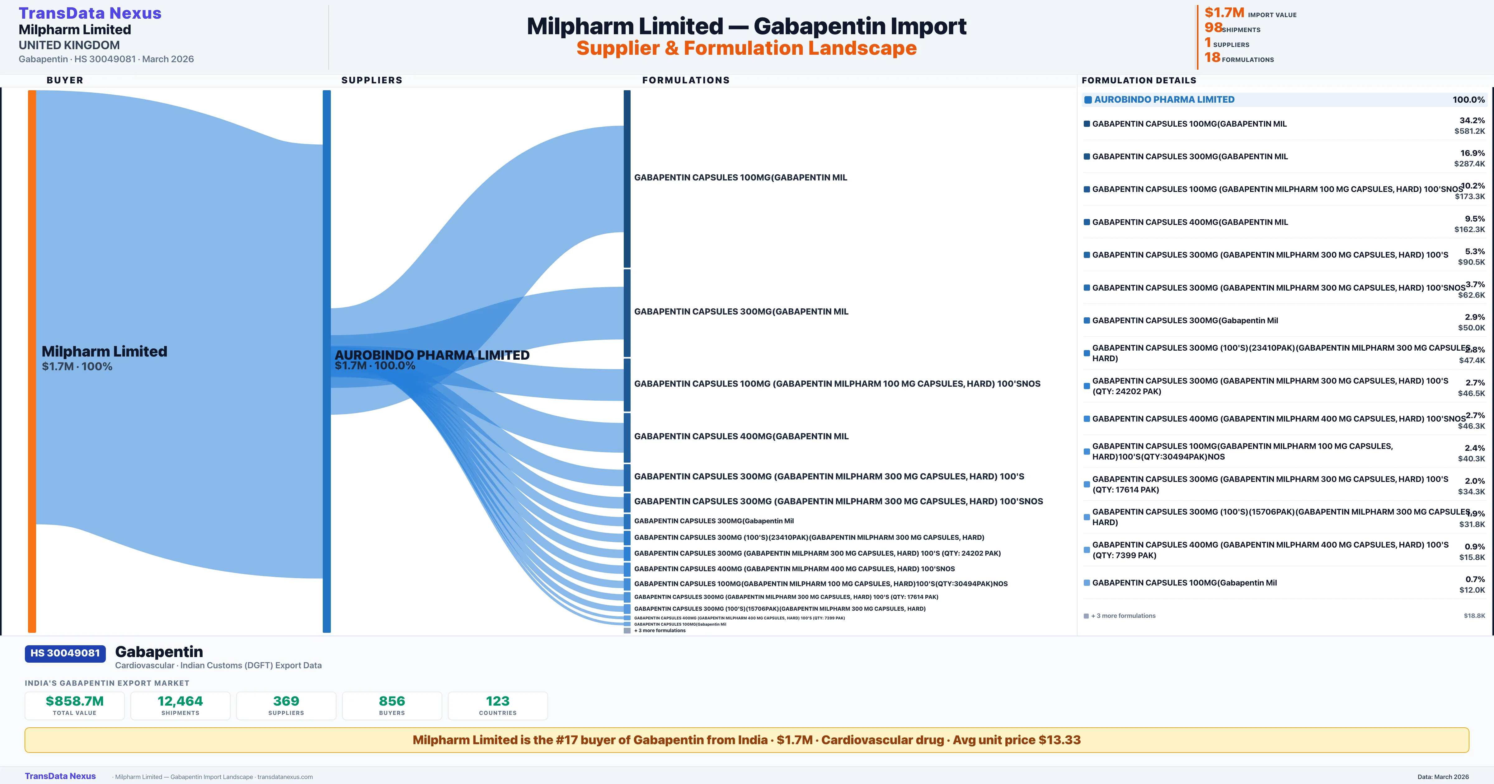 MILPHARM LIMITED, sources Gabapentin from 1 verified Indian supplier: AUROBINDO PHARMA LIMITED ($1.7M, 100.0%). This is based on 98 customs records.