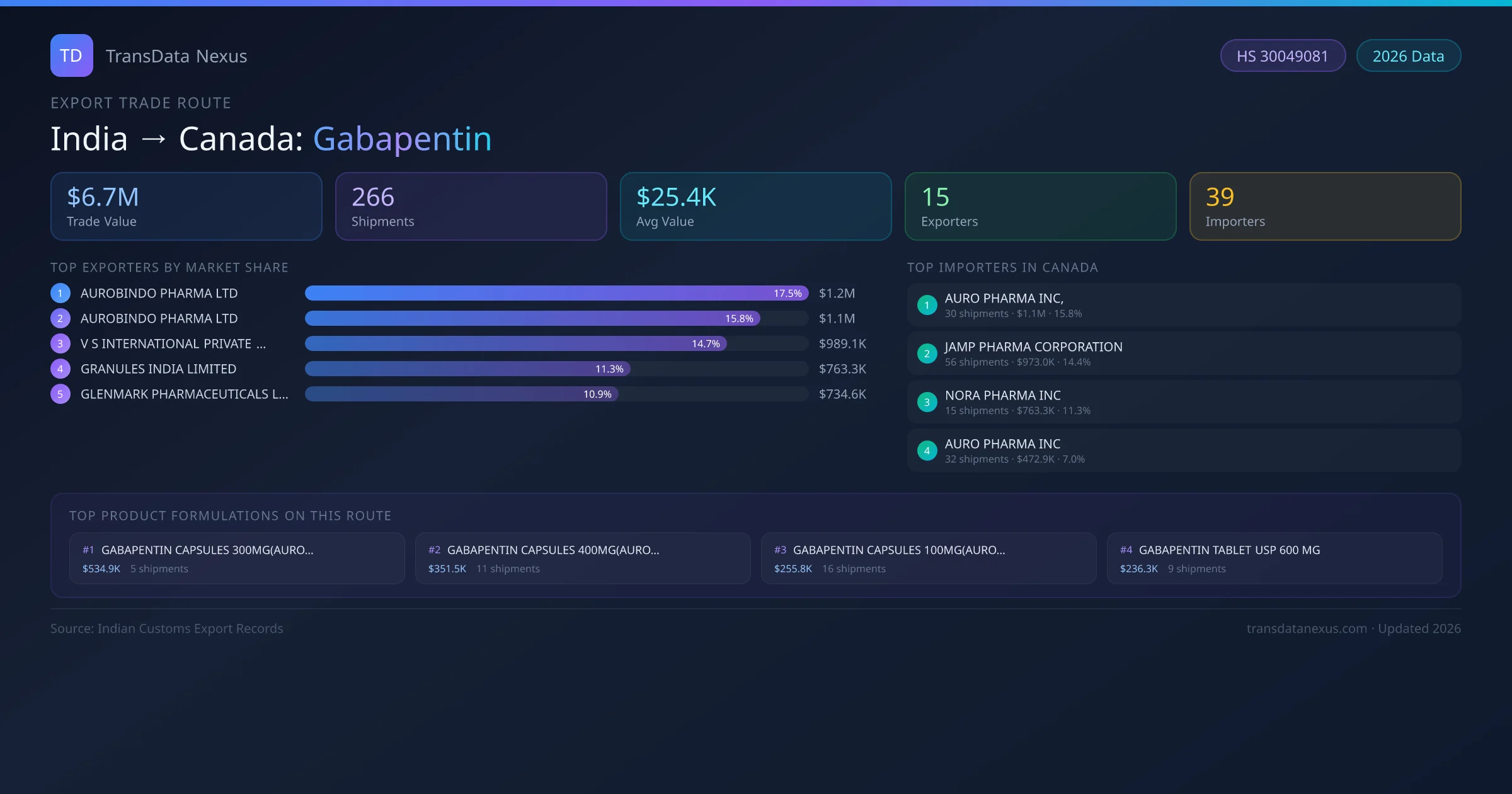- 1.Route Identification: India to Canada export trade corridor identified from Indian Customs (DGFT) records for Gabapentin.