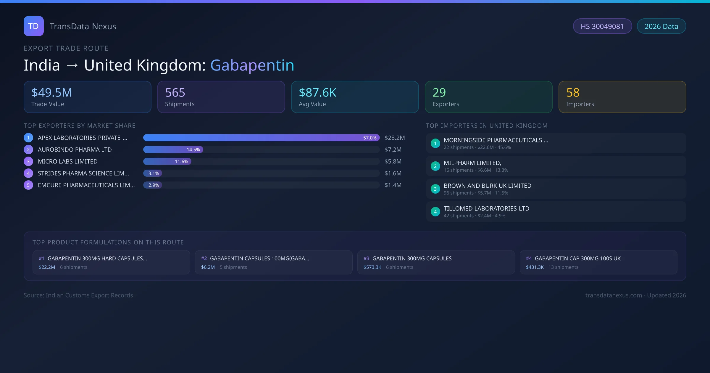 India exports Gabapentin to United Kingdom worth approximately $49.5M USD across 565 recorded shipments. The average value per shipment is $87.6K USD.