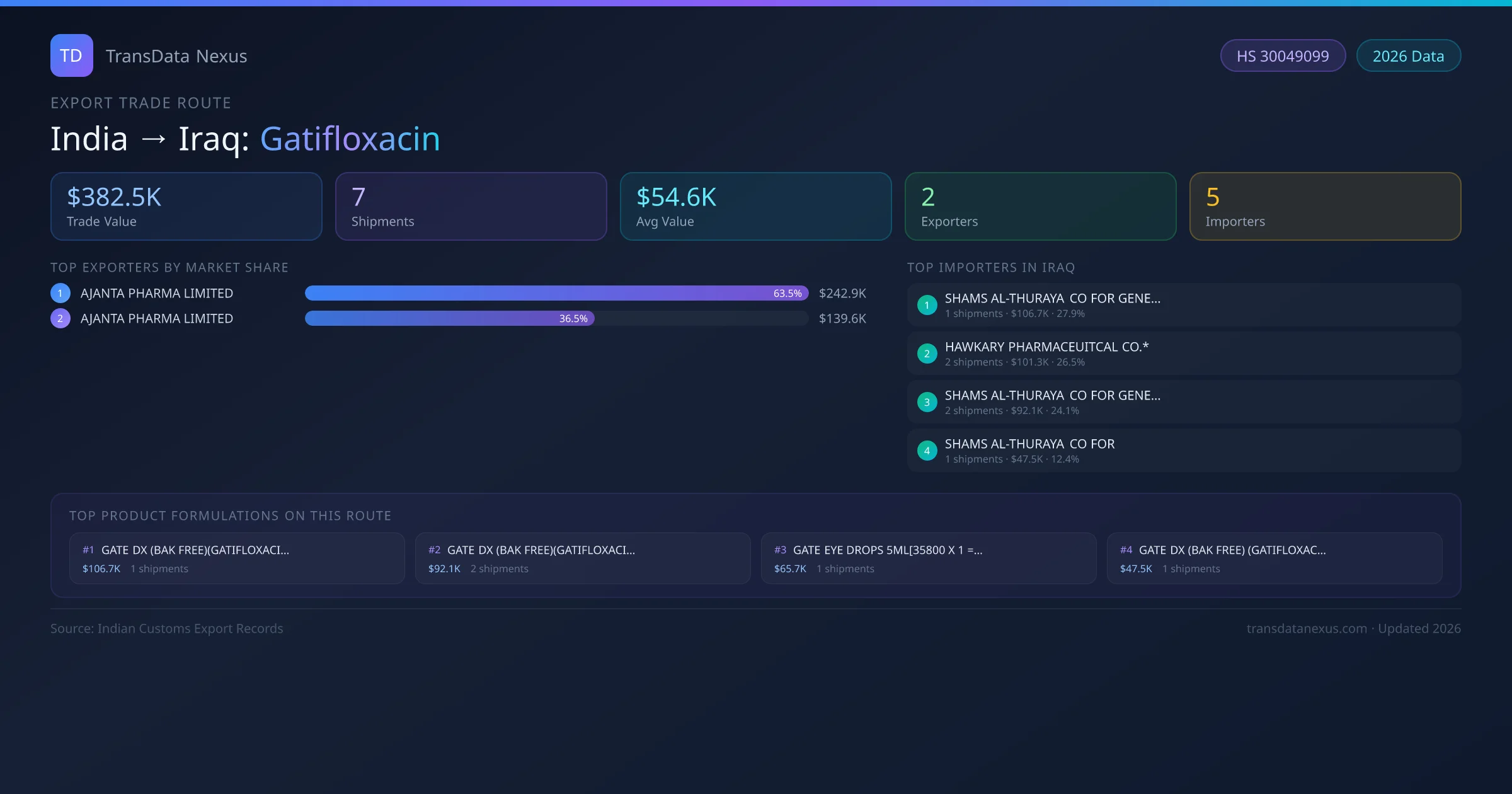 The India to Iraq Gatifloxacin corridor is one of India's established pharmaceutical export routes, with 7 shipments documented worth a combined $382.5K USD. The route is dominated by AJANTA PHARMA LIMITED, which alone accounts for roughly 64% of all export value, reflecting the consolidated nature of India's gatifloxacin manufacturing sector.