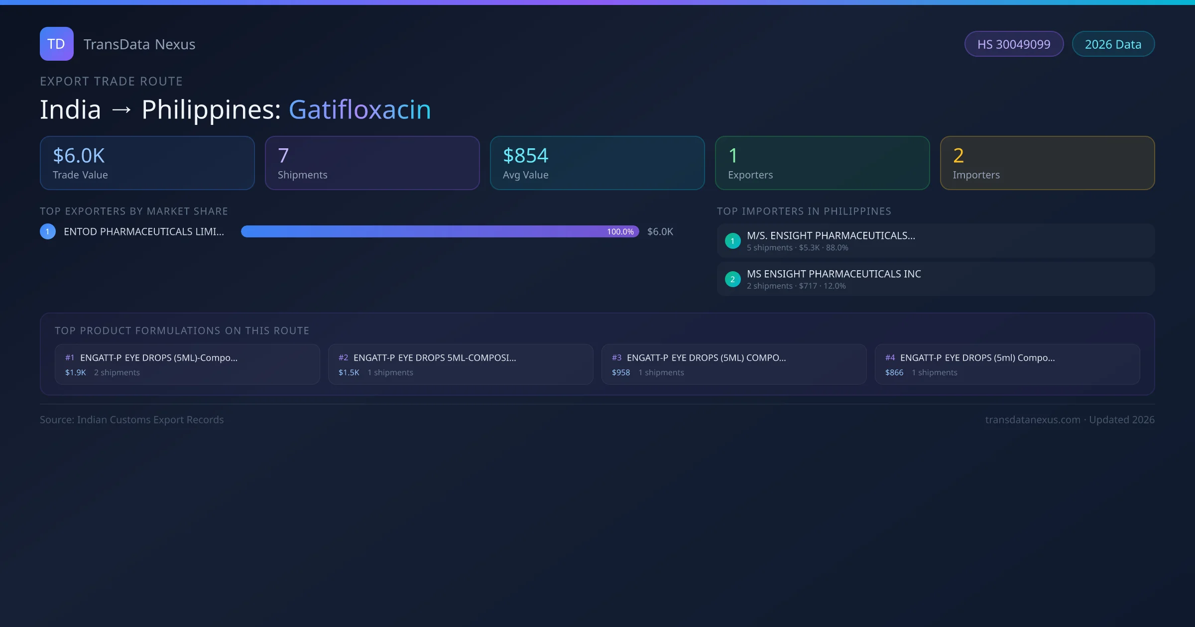 The India to Philippines Gatifloxacin corridor is one of India's established pharmaceutical export routes, with 7 shipments documented worth a combined $6.0K USD. The route is dominated by ENTOD PHARMACEUTICALS LIMITED, which alone accounts for roughly 100% of all export value, reflecting the consolidated nature of India's gatifloxacin manufacturing sector.
