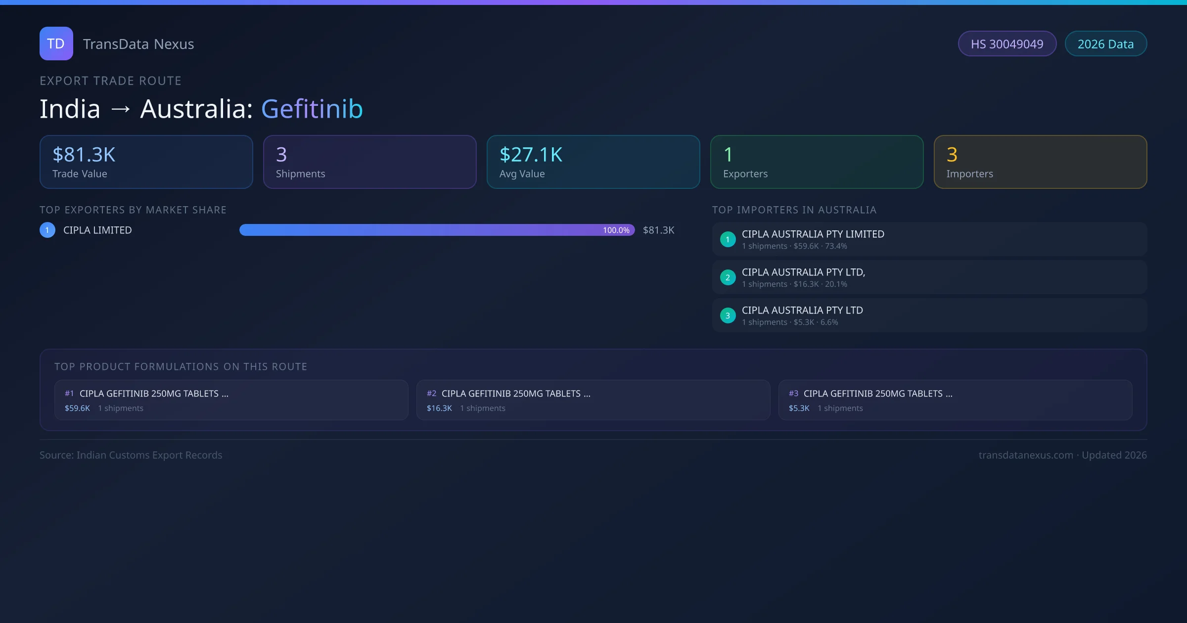 India has recorded 3 verified shipments of Gefitinib exported to Australia, representing a combined trade value of $81.3K USD. This corridor is served by 1 active Indian exporters, with an average shipment value of $27.1K USD. The leading Indian exporter is CIPLA LIMITED, which accounts for 100% of total export value with 3 shipments worth $81.3K USD. On the buying side, CIPLA AUSTRALIA PTY LIMITED is the largest importer in Australia with $59.6K USD in purchases. All data sourced from Indian Customs (DGFT) shipping bill records. Values reported in FOB USD.