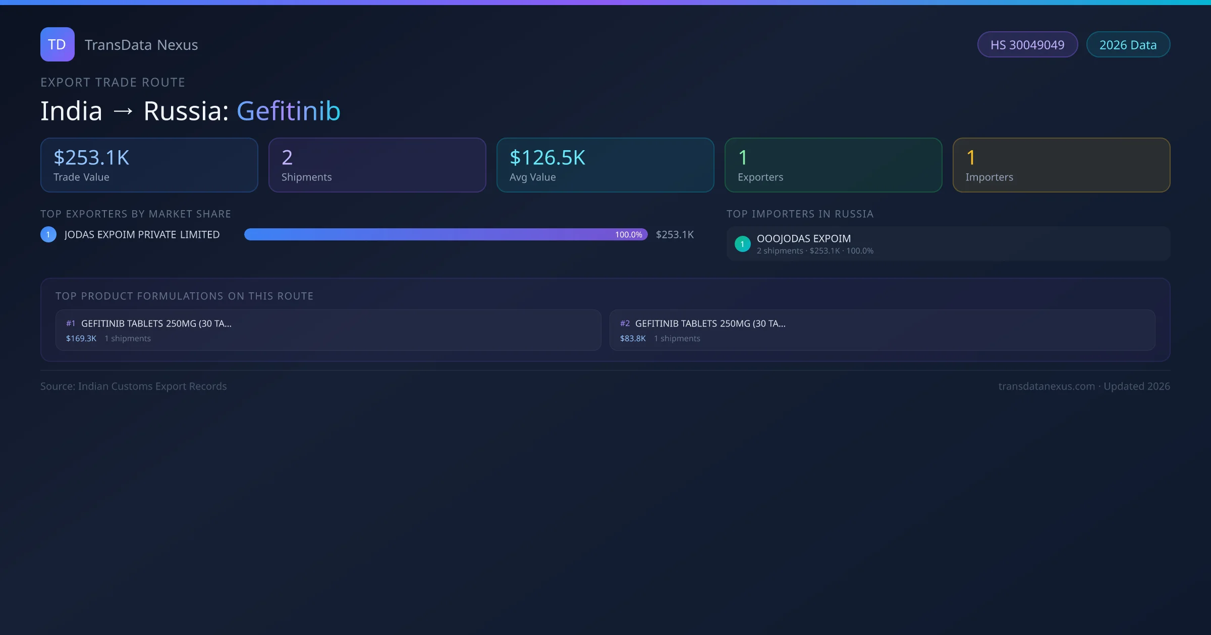 India exports Gefitinib to Russia worth approximately $253.1K USD across 2 recorded shipments. The average value per shipment is $126.5K USD.
