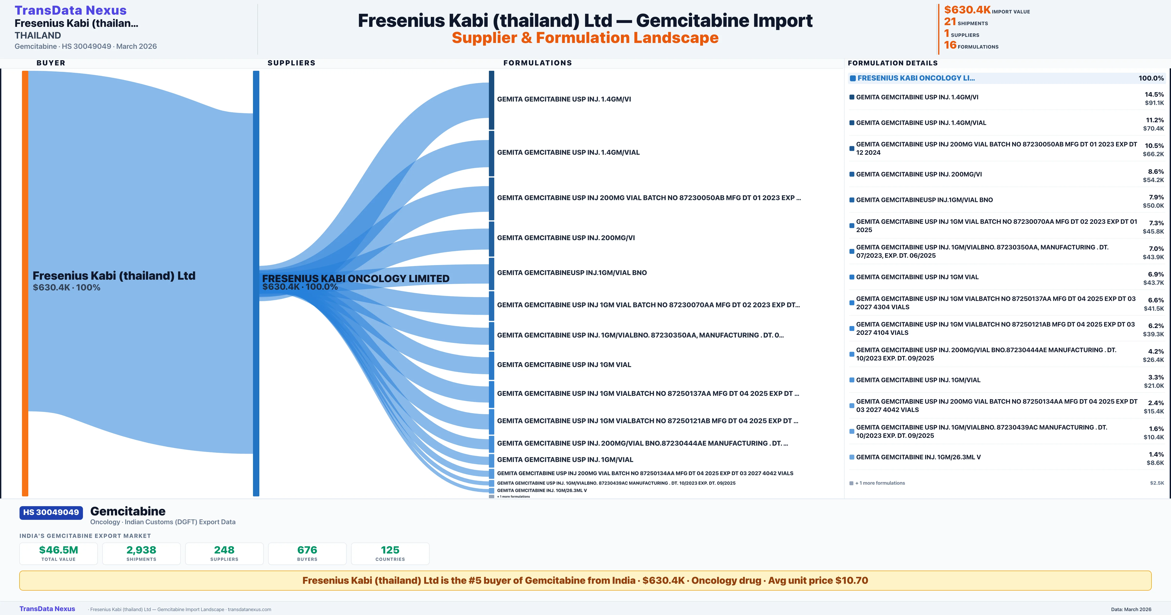 FRESENIUS KABI (THAILAND) LTD., sources Gemcitabine from 1 verified Indian supplier: FRESENIUS KABI ONCOLOGY LIMITED ($630.4K, 100.0%). This is based on 21 customs records.