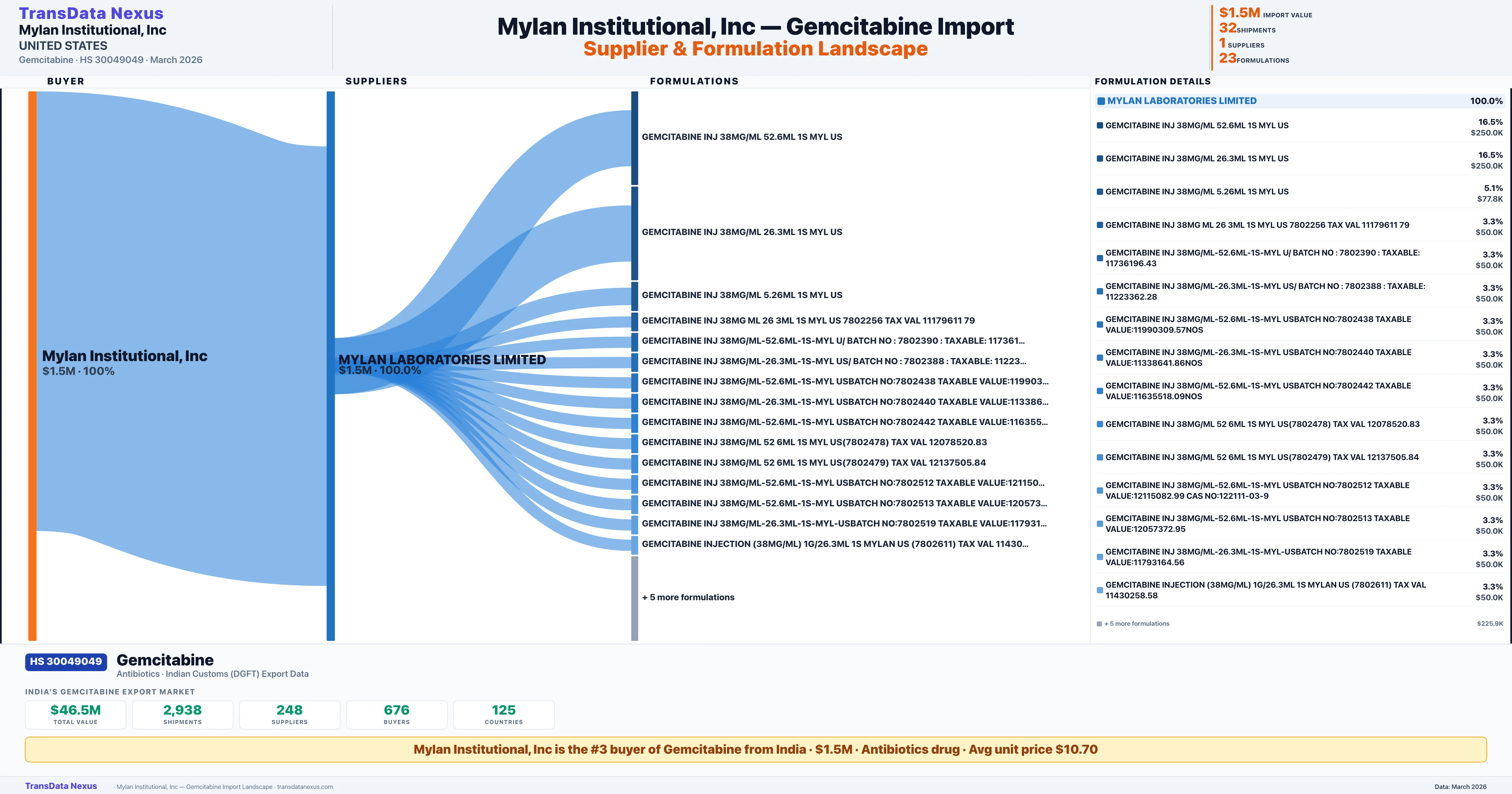 MYLAN INSTITUTIONAL INC sources Gemcitabine from 1 verified Indian supplier: MYLAN LABORATORIES LIMITED ($1.5M, 100.0%). This is based on 32 customs records.