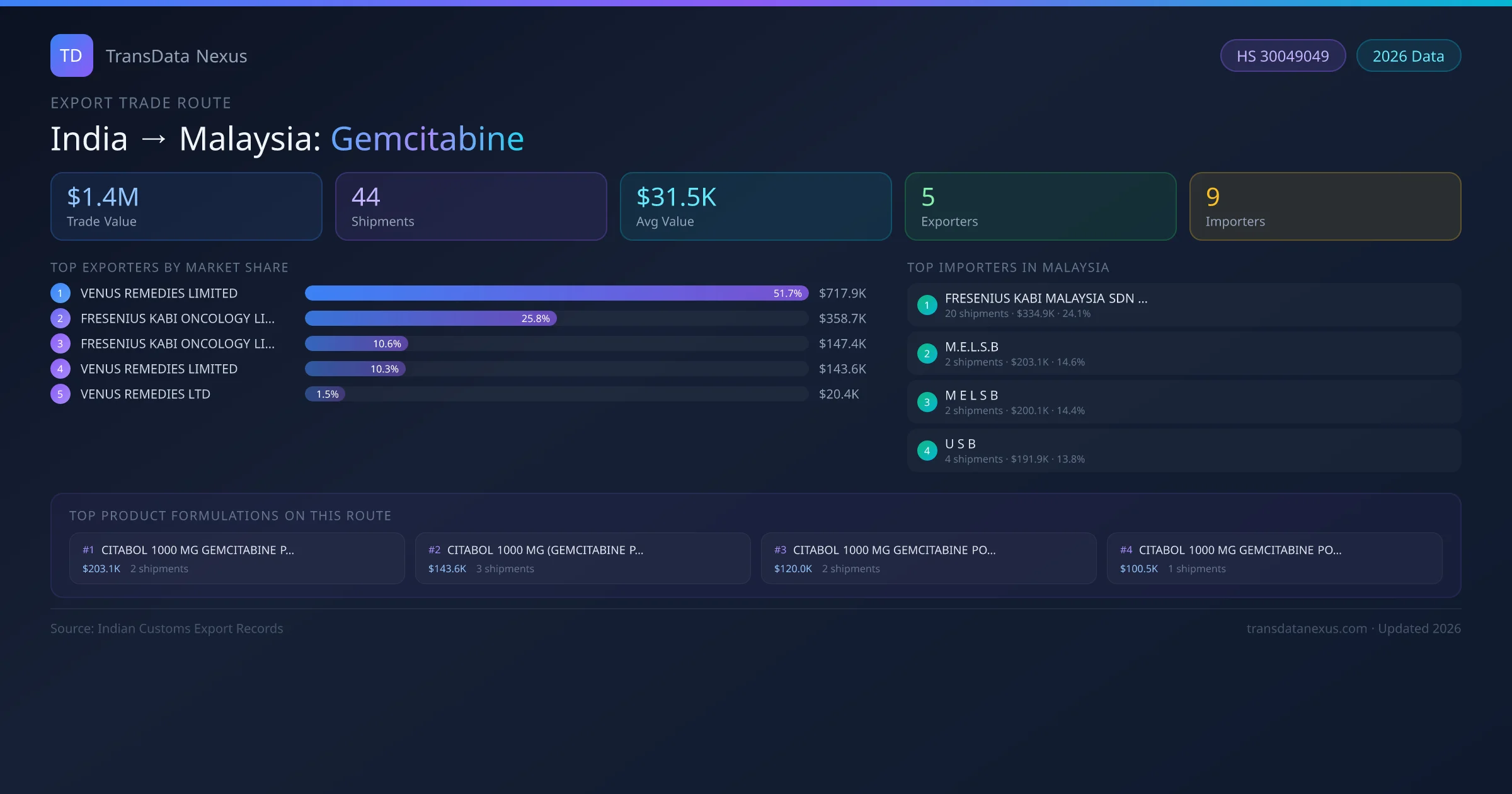 The leading Indian exporters of Gemcitabine to Malaysia are VENUS REMEDIES LIMITED, FRESENIUS KABI ONCOLOGY LIMITED, FRESENIUS KABI ONCOLOGY LIMITED . VENUS REMEDIES LIMITED holds the largest market share at approximately 52% of total trade value on this route.
