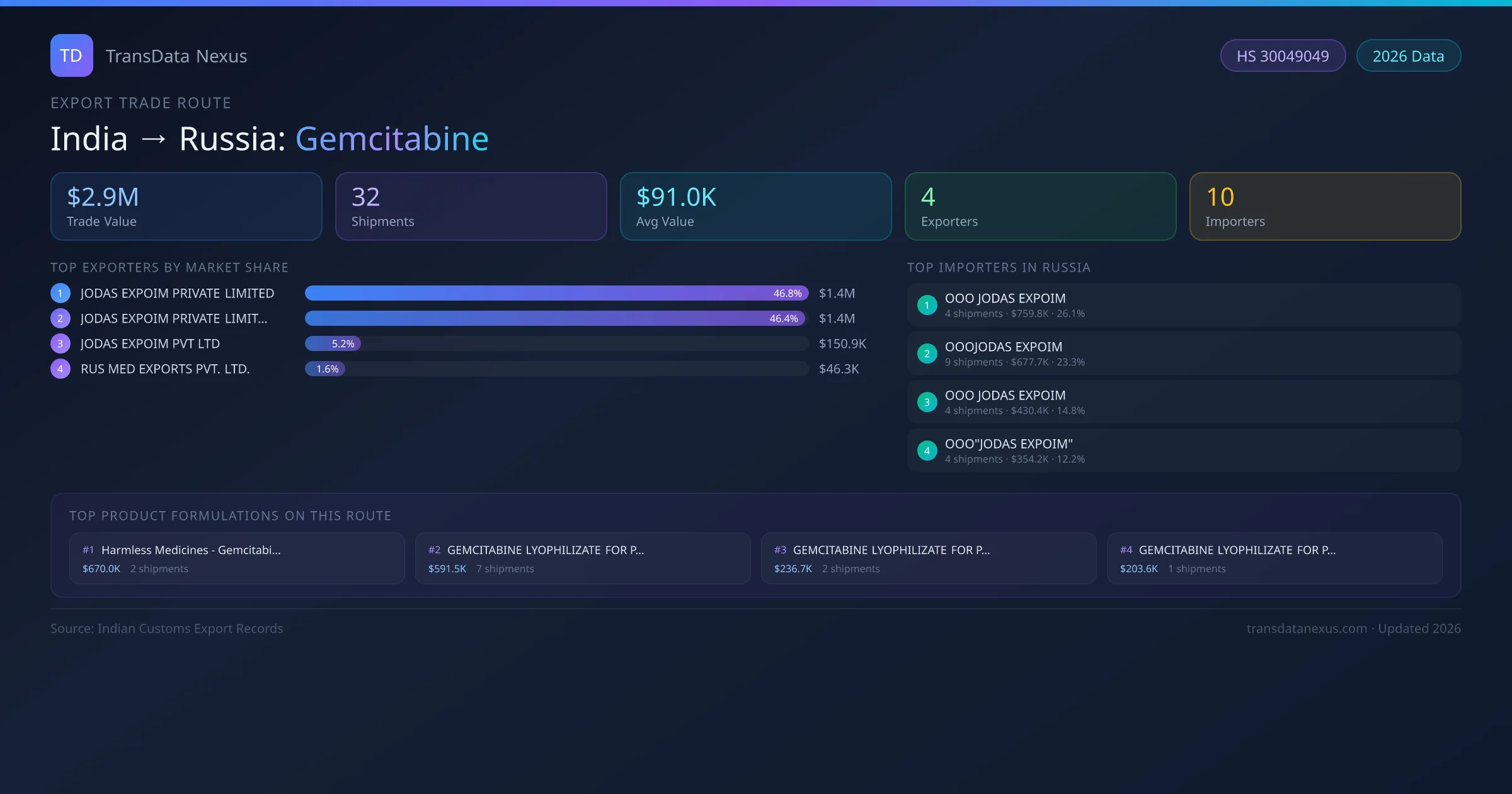 The India to Russia Gemcitabine corridor is one of India's established pharmaceutical export routes, with 32 shipments documented worth a combined $2.9M USD. The route is dominated by JODAS EXPOIM PRIVATE LIMITED, which alone accounts for roughly 47% of all export value, reflecting the consolidated nature of India's gemcitabine manufacturing sector.