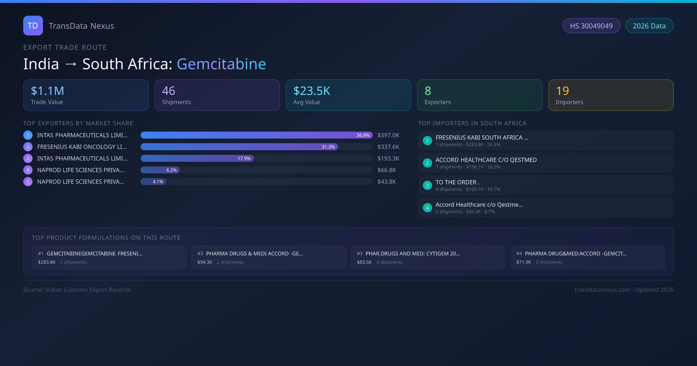 India has recorded 46 verified shipments of Gemcitabine exported to South Africa, representing a combined trade value of $1.1M USD. This corridor is served by 8 active Indian exporters, with an average shipment value of $23.5K USD. The leading Indian exporter is INTAS PHARMACEUTICALS LIMITED, which accounts for 37% of total export value with 20 shipments worth $397.0K USD. On the buying side, FRESENIUS KABI SOUTH AFRICA PTY is the largest importer in South Africa with $283.8K USD in purchases. The top 3 suppliers — INTAS PHARMACEUTICALS LIMITED, FRESENIUS KABI ONCOLOGY LIMITED, INTAS PHARMACEUTICALS LIMITED — together control 86% of total trade value on this route. All data sourced from Indian Customs (DGFT) shipping bill records. Values reported in FOB USD.