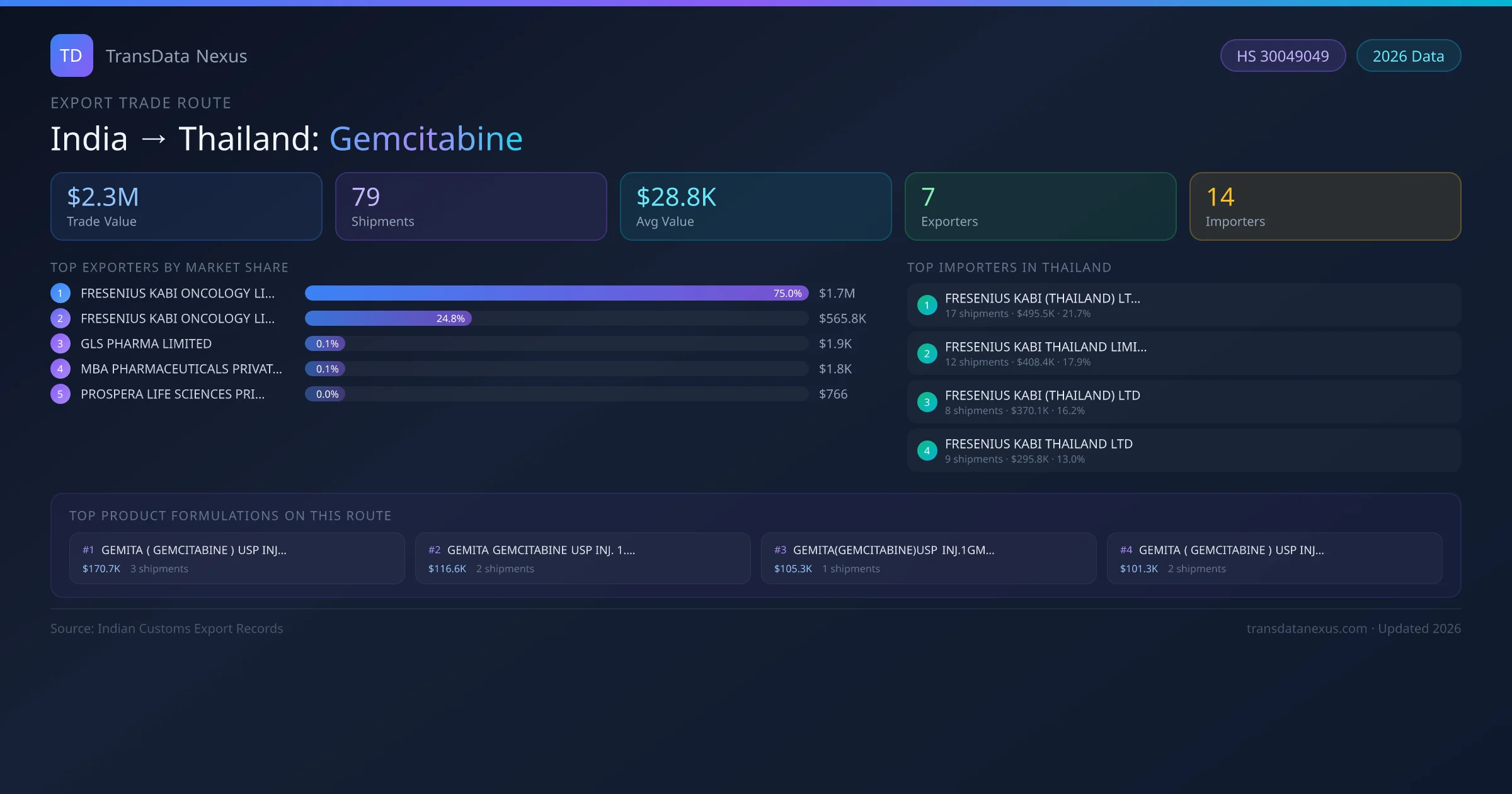 India has recorded 79 verified shipments of Gemcitabine exported to Thailand, representing a combined trade value of $2.3M USD. This corridor is served by 7 active Indian exporters, with an average shipment value of $28.8K USD. The leading Indian exporter is FRESENIUS KABI ONCOLOGY LIMITED, which accounts for 75% of total export value with 51 shipments worth $1.7M USD. On the buying side, FRESENIUS KABI (THAILAND) LTD., is the largest importer in Thailand with $495.5K USD in purchases. The top 3 suppliers — FRESENIUS KABI ONCOLOGY LIMITED, FRESENIUS KABI ONCOLOGY LIMITED , GLS PHARMA LIMITED — together control 100% of total trade value on this route. All data sourced from Indian Customs (DGFT) shipping bill records. Values reported in FOB USD.