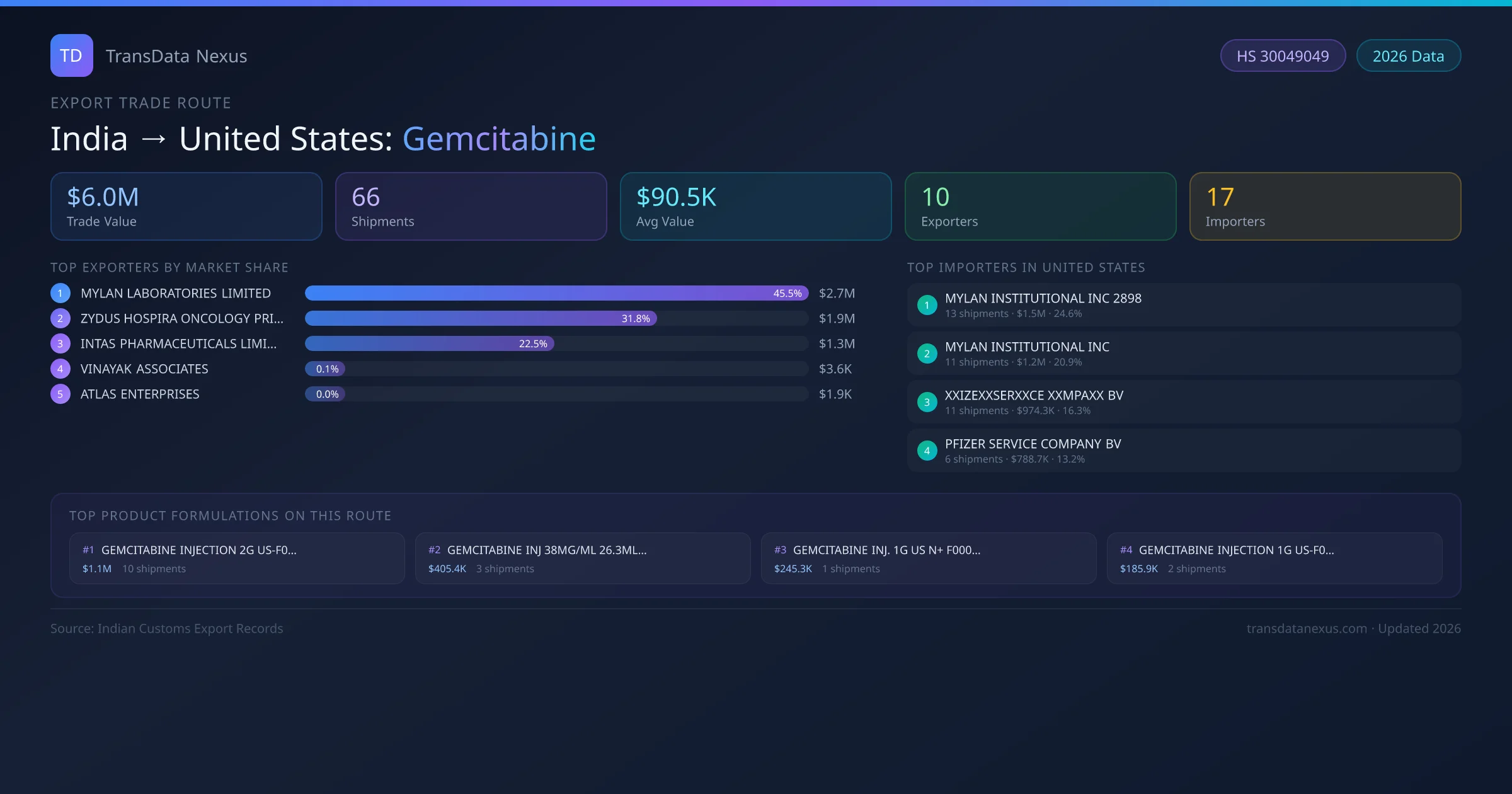 The India to United States Gemcitabine corridor is one of India's established pharmaceutical export routes, with 66 shipments documented worth a combined $6.0M USD. The route is dominated by MYLAN LABORATORIES LIMITED, which alone accounts for roughly 46% of all export value, reflecting the consolidated nature of India's gemcitabine manufacturing sector.