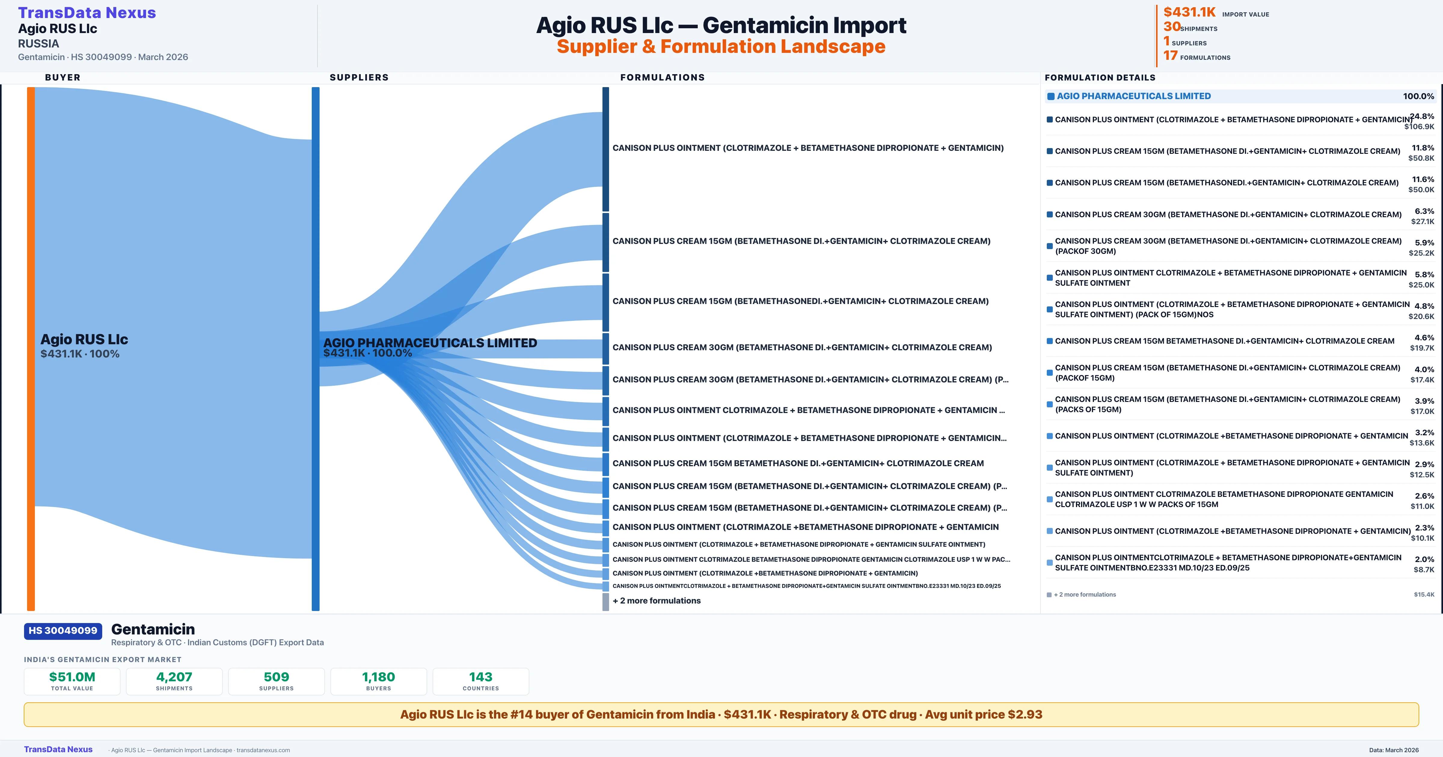 AGIO RUS LLC imports 17 distinct Gentamicin formulations from India. The top formulation is CANISON PLUS OINTMENT (CLOTRIMAZOLE + BETAMETHASONE DIPROPIO with 3 shipments worth $106.9K.