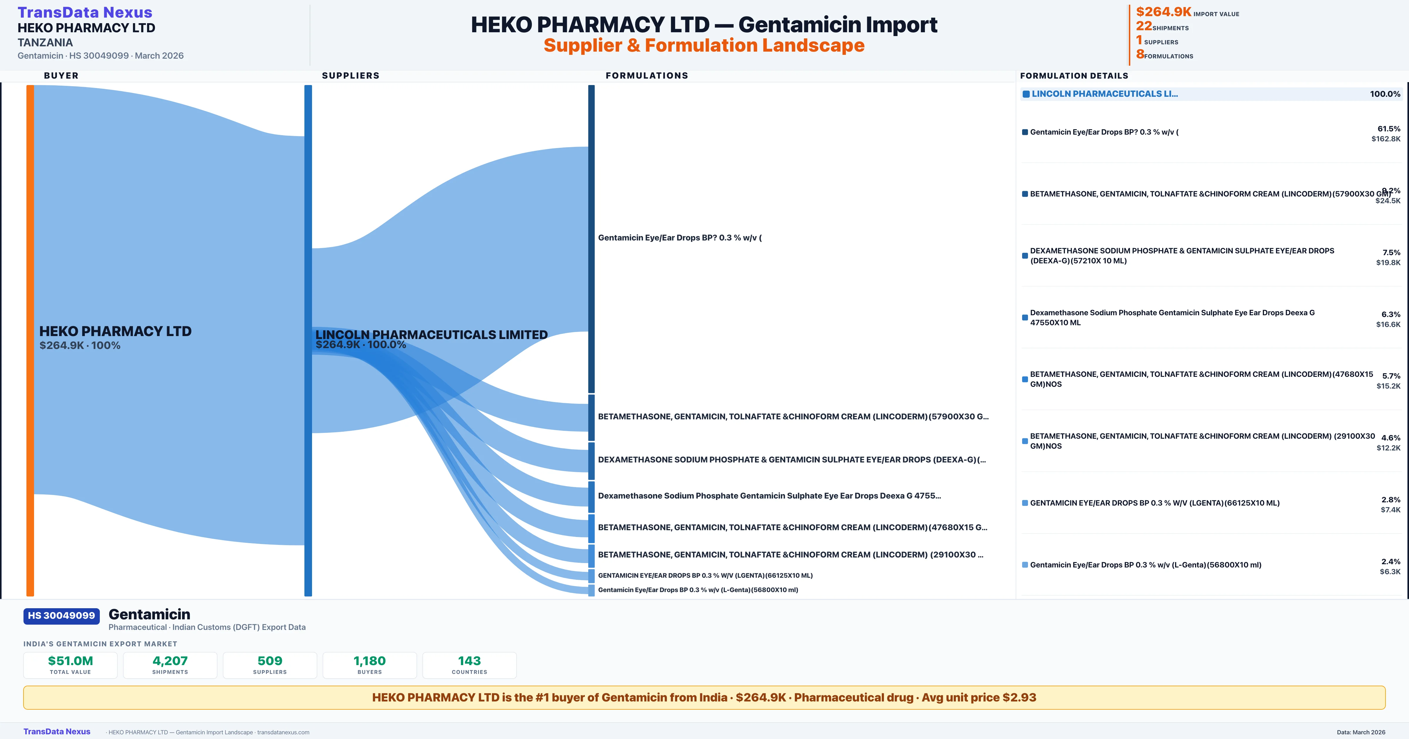 HEKO PHARMACY LTD sources Gentamicin from 1 verified Indian supplier: LINCOLN PHARMACEUTICALS LIMITED ($264.9K, 100.0%). This is based on 22 customs records.