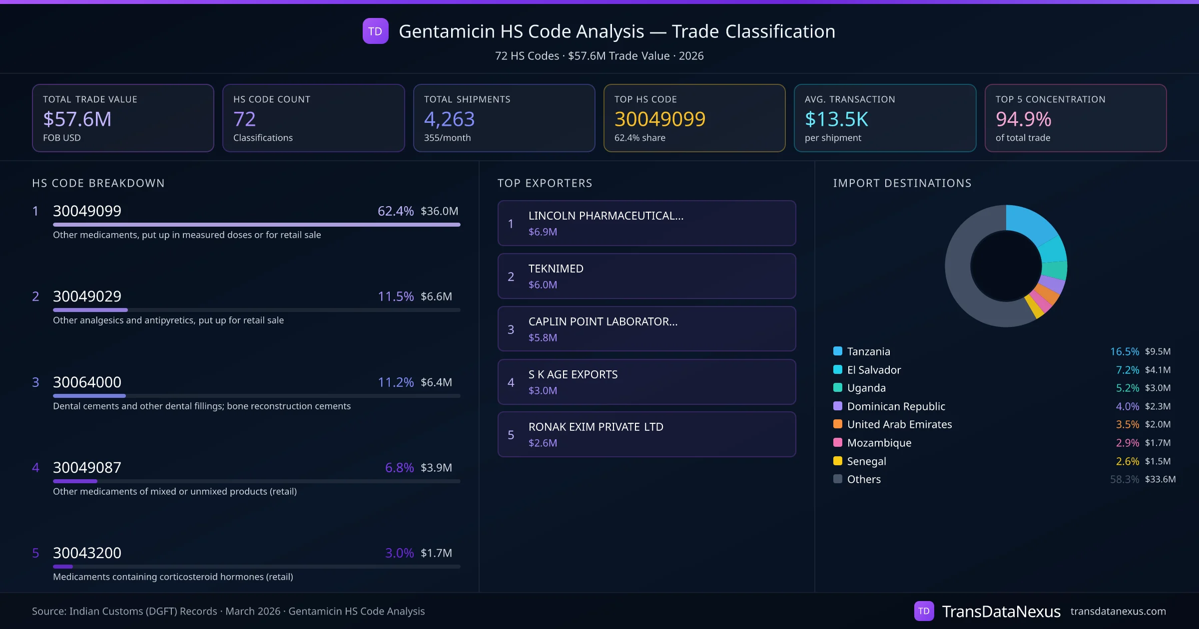 India exports Gentamicin under 72 distinct HS code classifications, representing a total trade value of $57.6M across 4,263 shipments. The dominant classification is HS 30049099 (Other medicaments, put up in measured doses or for retail sale), accounting for 62.4% of all Gentamicin trade at $36.0M. HS 30049029 (Other analgesics and antipyretics, put up for retail sale) follows at 11.5% ($6.6M). The top 5 HS codes together account for 94.9% of total Gentamicin trade from India. The average transaction value is $13521. Key importing markets include Tanzania, El Salvador, Uganda. Leading exporters include LINCOLN PHARMACEUTICALS LTD and TEKNIMED . Data sourced from Indian Customs (DGFT) shipping bill records.