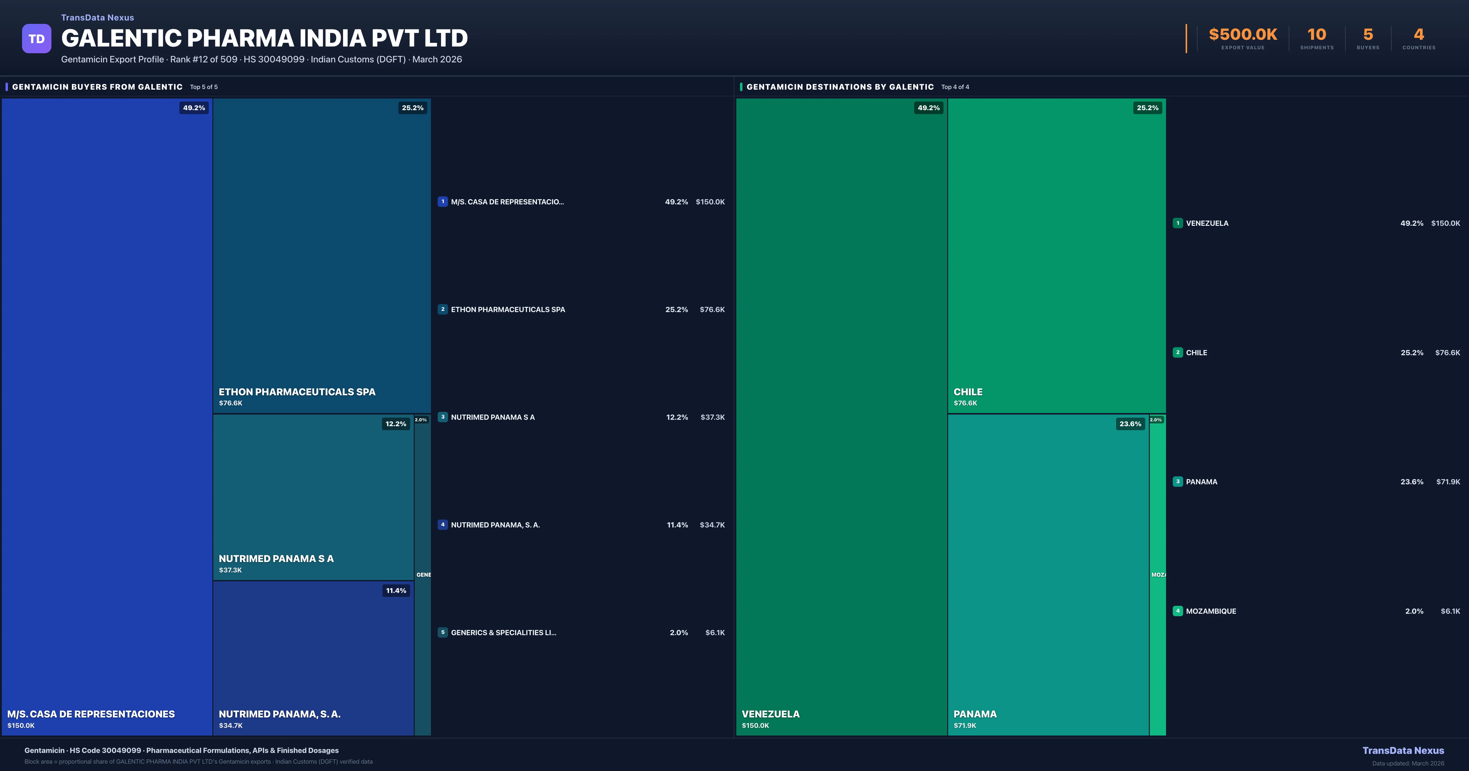 Galentic Pharma India Pvt Ltd supplies Gentamicin to 5 buyers globally. The largest buyer is M/S. CASA DE REPRESENTACIONES (VENEZUELA), followed by ETHON PHARMACEUTICALS SPA (CHILE) and NUTRIMED PANAMA S A (PANAMA). These buyers represent pharmaceutical distributors, hospital groups, and government procurement agencies in their respective markets.