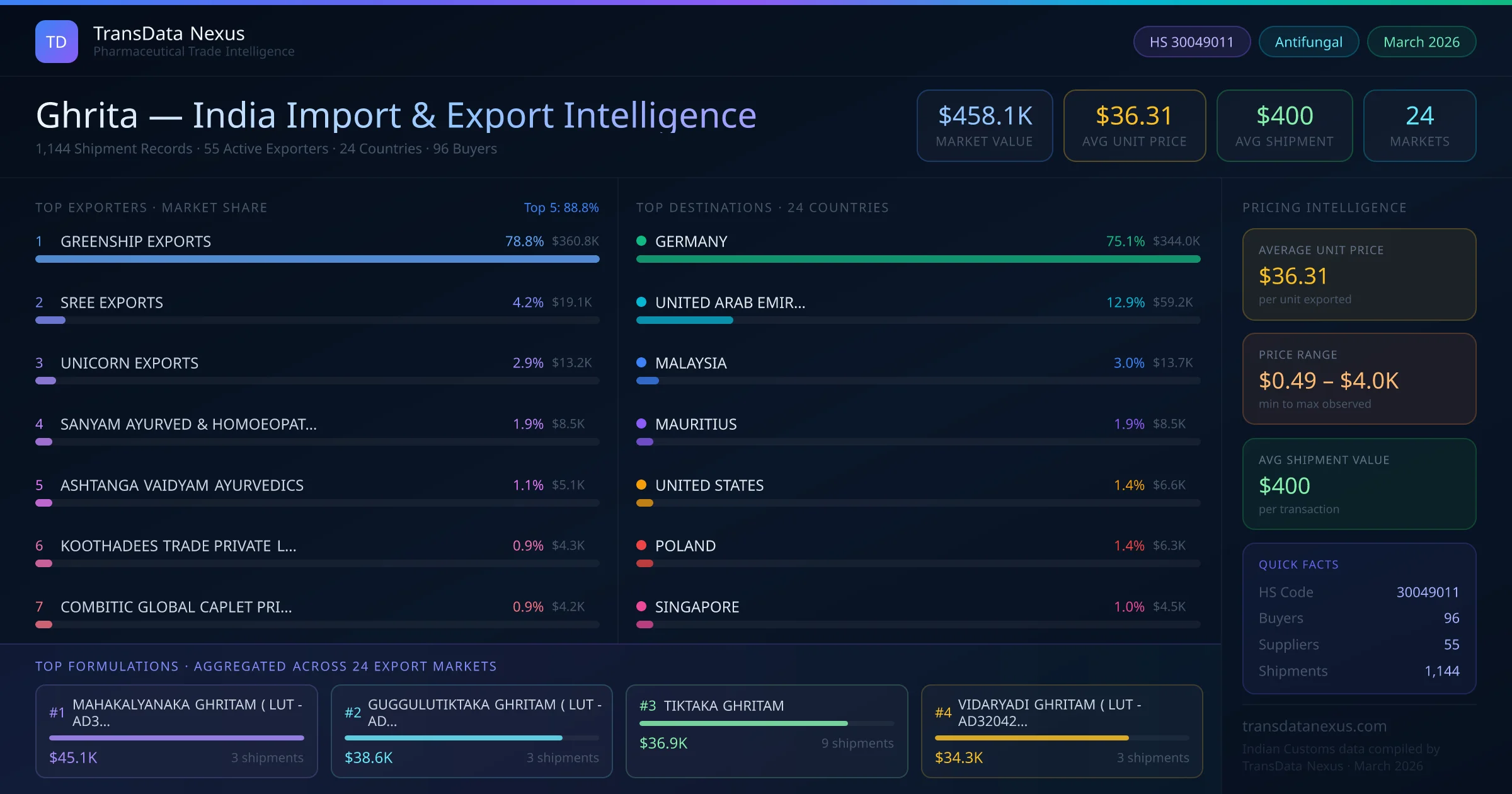 The average unit price for ghrita exports from India is $36.31 per unit, with prices ranging from $0.49 to $4021.46 depending on formulation and order volume.