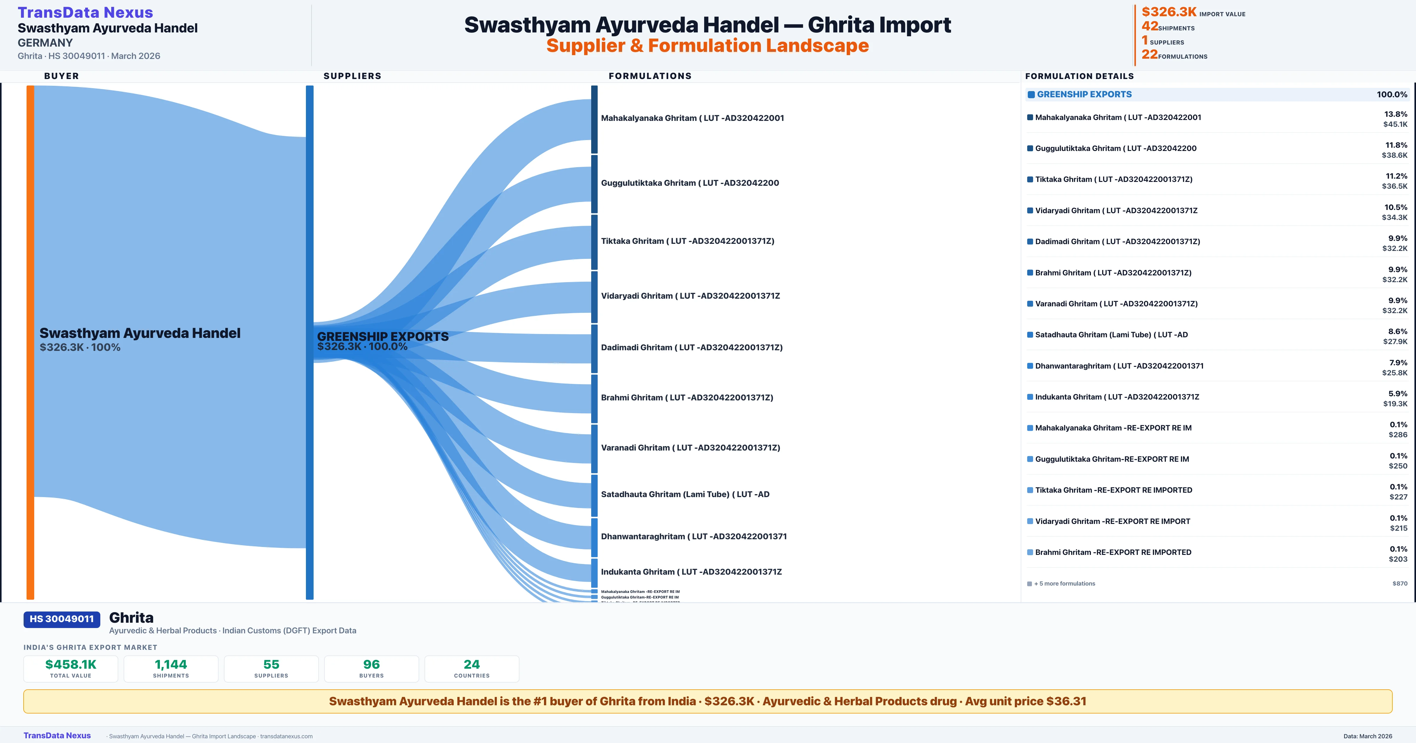 SWASTHYAM AYURVEDA HANDEL sources Ghrita from 1 verified Indian supplier: GREENSHIP EXPORTS ($326.3K, 100.0%). This is based on 42 customs records.