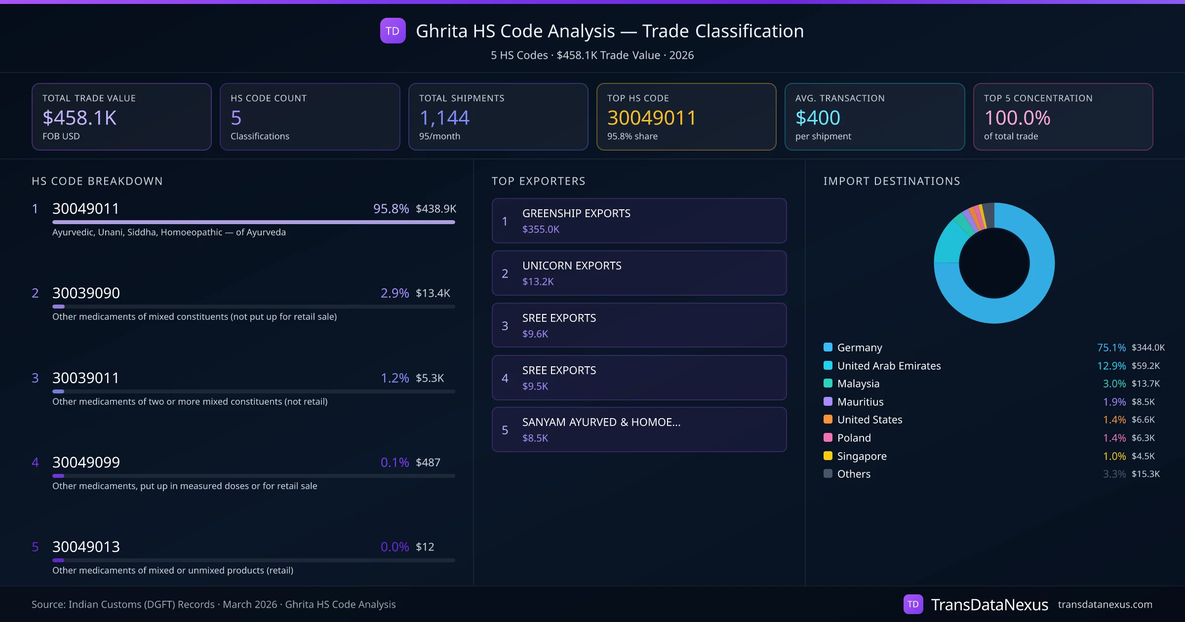 India exports Ghrita under 5 distinct HS code classifications, representing a total trade value of $458.1K across 1,144 shipments. The dominant classification is HS 30049011 (Ayurvedic, Unani, Siddha, Homoeopathic โ of Ayurveda), accounting for 95.8% of all Ghrita trade at $438.9K. HS 30039090 (Other medicaments of mixed constituents (not put up for retail sale)) follows at 2.9% ($13.4K). The top 5 HS codes together account for 100.0% of total Ghrita trade from India. The average transaction value is $400. Key importing markets include Germany, United Arab Emirates, Malaysia. Leading exporters include GREENSHIP EXPORTS and UNICORN EXPORTS. Data sourced from Indian Customs (DGFT) shipping bill records.