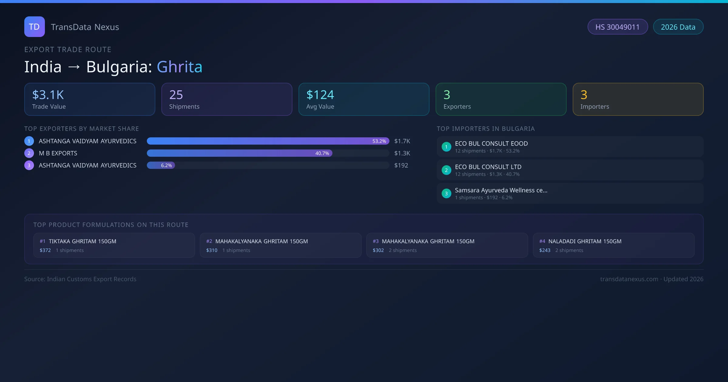 India has recorded 25 verified shipments of Ghrita exported to Bulgaria, representing a combined trade value of $3.1K USD. This corridor is served by 3 active Indian exporters, with an average shipment value of $124 USD. The leading Indian exporter is ASHTANGA VAIDYAM AYURVEDICS , which accounts for 53% of total export value with 12 shipments worth $1.7K USD. On the buying side, ECO BUL CONSULT EOOD is the largest importer in Bulgaria with $1.7K USD in purchases. The top 3 suppliers — ASHTANGA VAIDYAM AYURVEDICS , M B EXPORTS, ASHTANGA VAIDYAM AYURVEDICS — together control 100% of total trade value on this route. All data sourced from Indian Customs (DGFT) shipping bill records. Values reported in FOB USD.