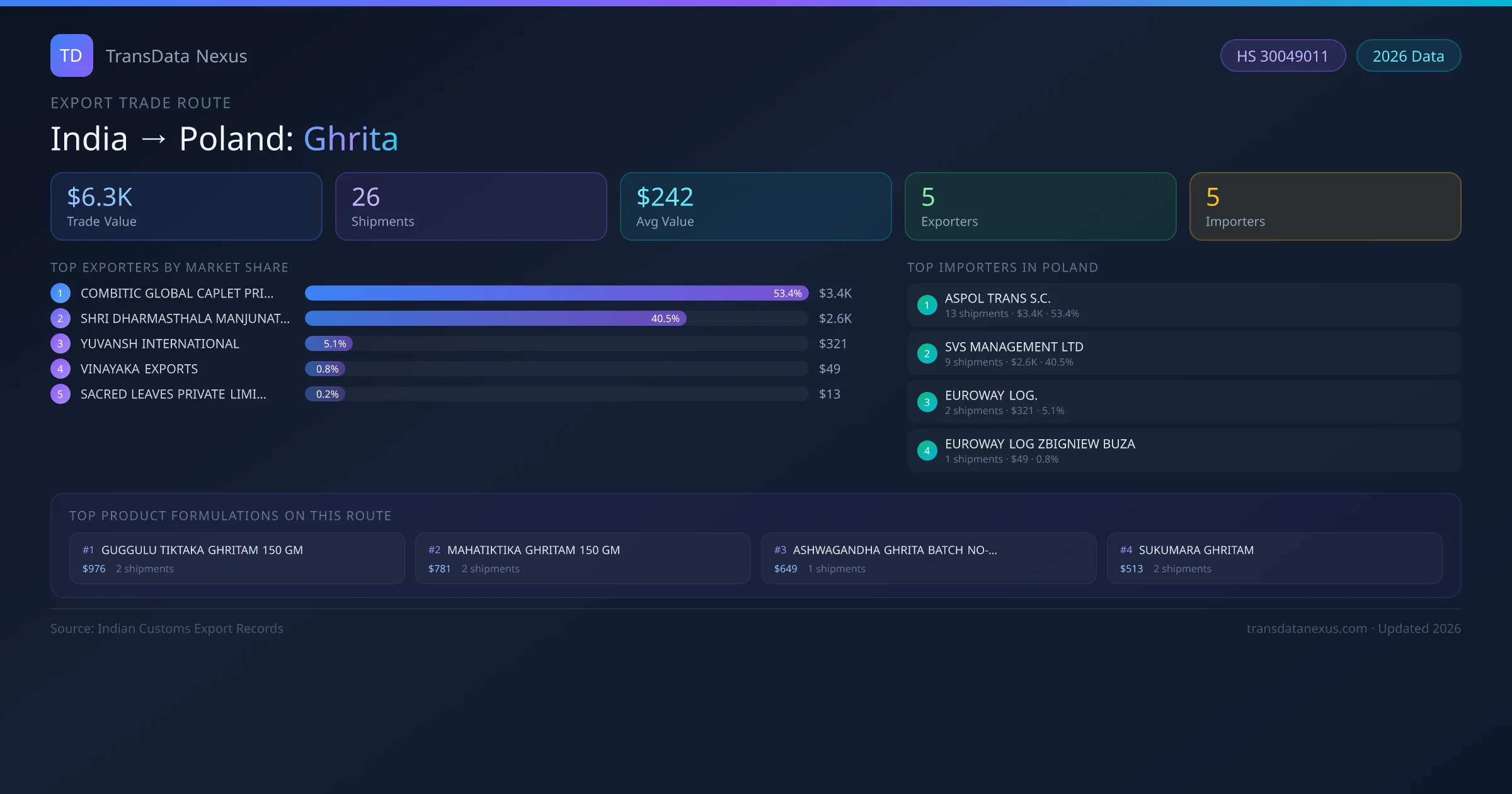 India exports Ghrita to Poland worth approximately $6.3K USD across 26 recorded shipments. The average value per shipment is $242 USD.
