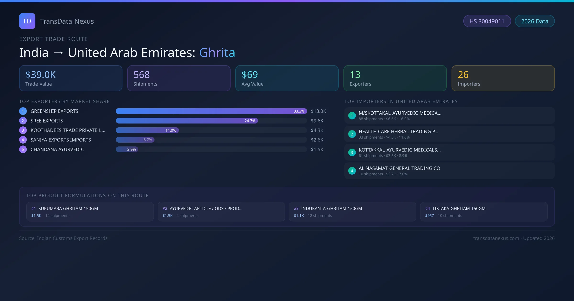 India has recorded 568 verified shipments of Ghrita exported to United Arab Emirates, representing a combined trade value of $39.0K USD. This corridor is served by 13 active Indian exporters, with an average shipment value of $69 USD. The leading Indian exporter is GREENSHIP EXPORTS, which accounts for 33% of total export value with 198 shipments worth $13.0K USD. On the buying side, M/SKOTTAKAL AYURVEDIC MEDICALS LLC is the largest importer in United Arab Emirates with $6.6K USD in purchases. The top 3 suppliers — GREENSHIP EXPORTS, SREE EXPORTS, KOOTHADEES TRADE PRIVATE LIMITED — together control 69% of total trade value on this route. All data sourced from Indian Customs (DGFT) shipping bill records. Values reported in FOB USD.